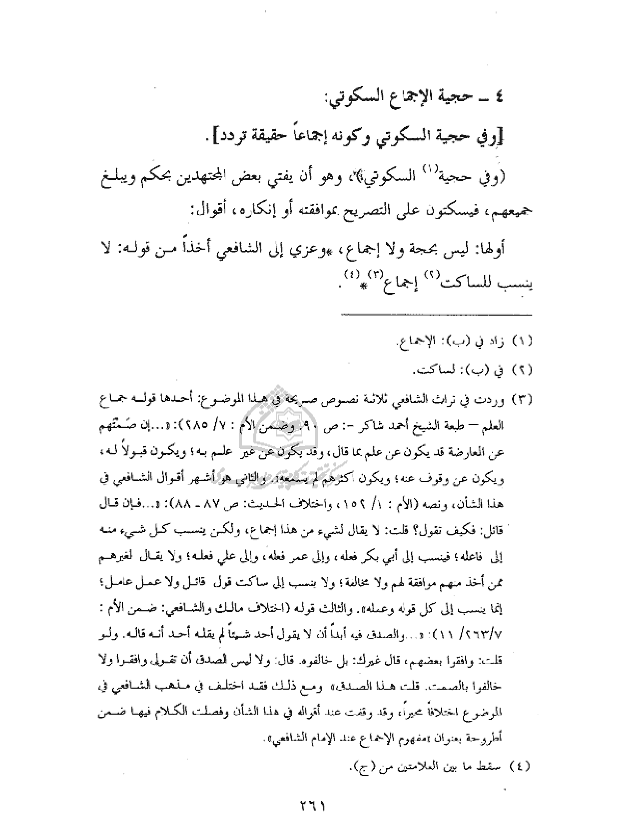 (¬٣) وردت في تراث الشافعي ثلاثة نصوص صريحة في هذا الموضوع: أحدها قوله جماع العلم - طبعة الشيخ أحمد شاكر -: ص ٩٠. وضمن الأم: ٧/ ٢٨٥): «. . . إن صمتهم عن المعارضة قد يكون عن علم بما قال، وقد يكون عن غير علم به؛ ويكون قبولا له، ويكون عن وقوف عنه؛ ويكون أكثرهم لم يسمعه». والثاني هو أشهر أقوال الشافعي في هذا الشأن، ونصه (الأم: ١/ ١٥٢، واختلاف الحديث: ص ٨٧ - ٨٨): «. . . فإن قال قائل: فكيف تقول؟ قلت: لا يقال لشيء من هذا إجماع، ولكن ينسب كل شيء منه إلى فاعله؛ فينسب إلى أبي بكر فعله، وإلى عمر فعله؛ وإلى علي فعله؛ ولا يقال لغيرهم ممن أخذ منهم موافقة لهم ولا مخالفة؛ ولا ينسب إلى ساكت قول قائل ولا عمل عامل؛ إنما ينسب إلى كل قوله وعمله». والثالث قوله (اختلاف مالك والشافعي: ضمن الأم: ٧/ ٢٦٣/١١): «. . . والصدق فيه أبدا أن لا يقول أحد شيئا لم يقله أحد أنه قاله. ولو قلت: وافقوا بعضهم، قال غيرك: بل خالفوه. قال: ولا ليس الصدق أن تقول وافقوا ولا خالفوا بالصمت. قلت هذا الصدق» ومع ذلك فقد اختلف في مذهب الشافعي في الموضوع اختلافا محيرا، وقد وقفت عند أقواله في هذا الشأن وفصلت الكلام فيها ضمن أطروحة بعنوان «مفهوم الإجماع عند الإمام الشافعي».