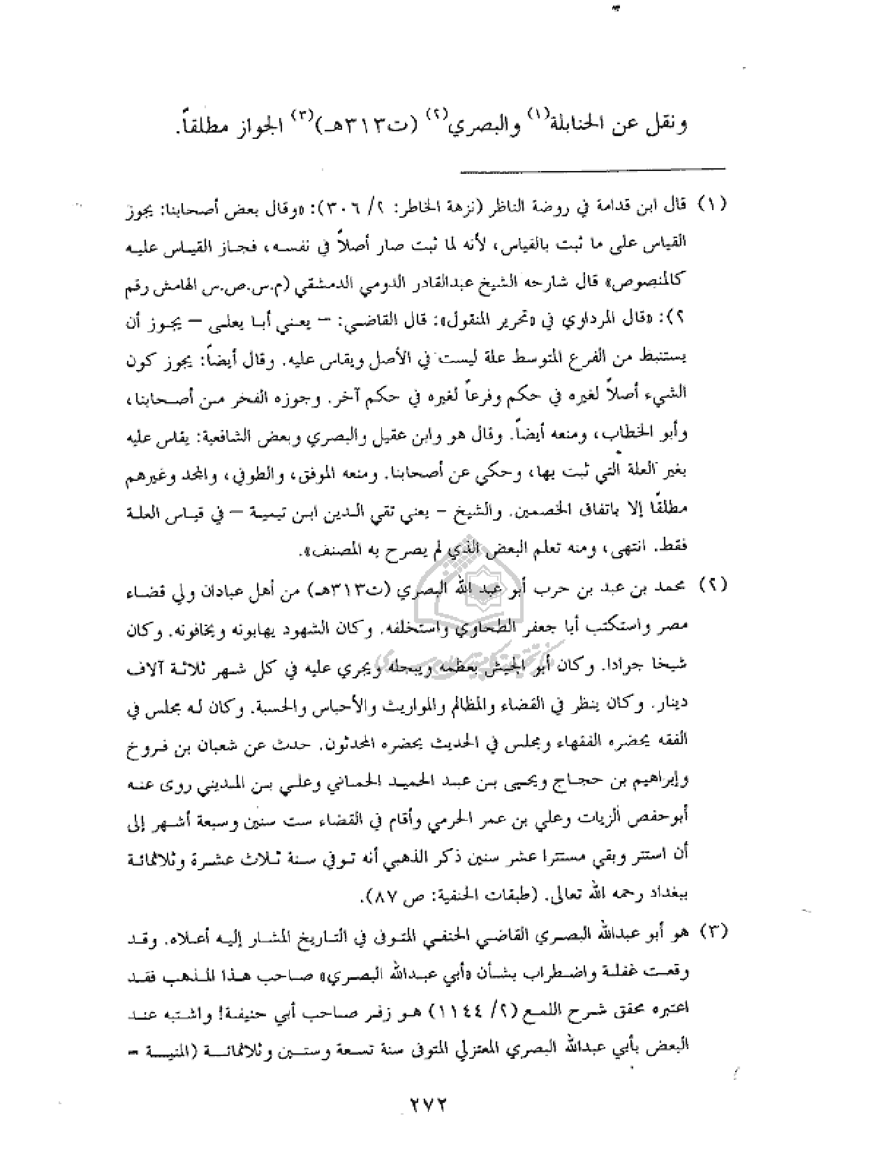 (¬٣) هو أبو عبد الله البصري القاضي الحنفي المتوفى في التاريخ المشار إليه أعلاه. وقد وقعت غفلة واضطراب بشأن «أبي عبد الله البصري» صاحب هذا المذهب فقد اعتبره محقق شرح اللمع (٢/ ١١٤٤) هو زفر صاحب أبي حنيفة! واشتبه عند البعض بأبي عبد الله البصري المعتزلي المتوفى سنة تسعة وستين وثلاثمائة (المنية -