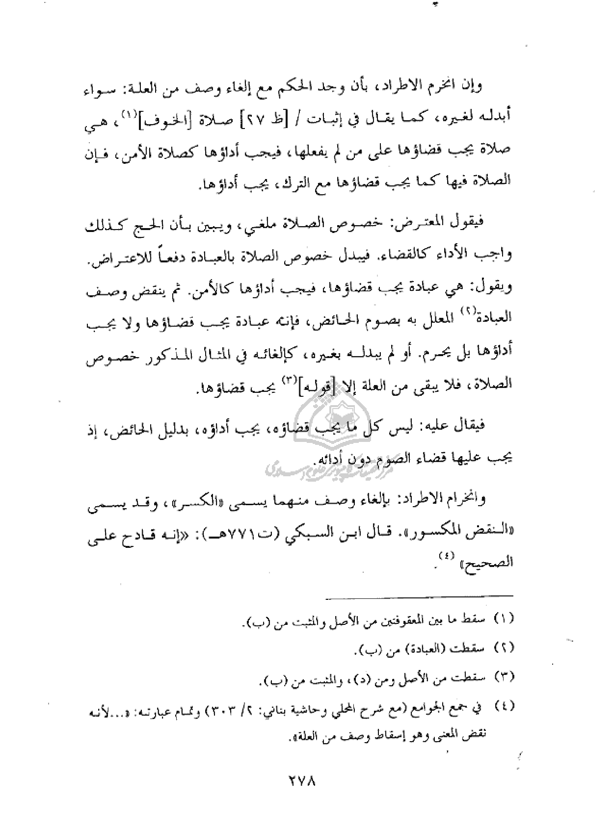 (¬٤) في جمع الجوامع (مع شرح المحلي وحاشية بناني : ٢/ ٣٠٣) وتمام عبارته : «. . . لأنه نقض المعنى وهو إسقاط وصف من العلة».