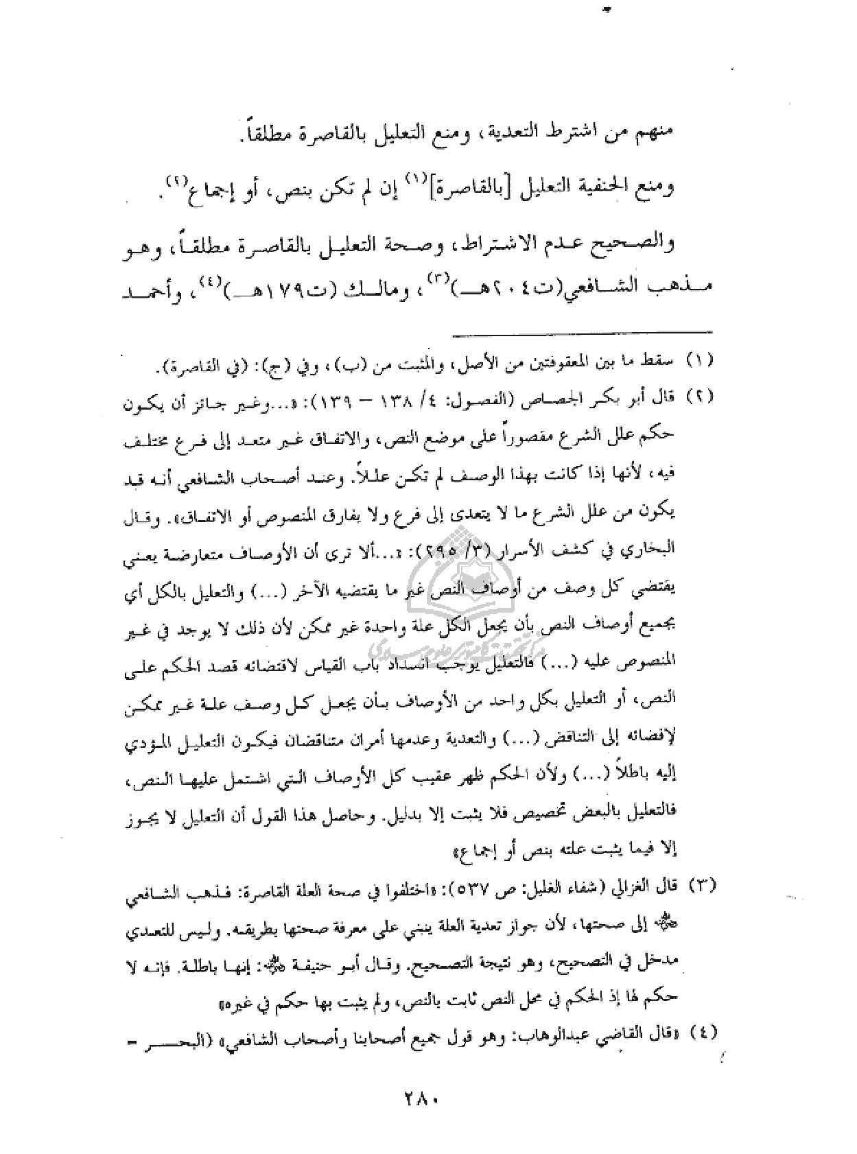 (¬٣) قال الغزالي (شفاء الغليل : ص ٥٣٧) : «اختلفوا في صحة العلة القاصرة : فذهب الشافعي رضي الله عنه إلى صحتها، لأن جواز تعدية العلة ينبني على معرفة صحتها بطريقه. وليس للتعدي مدخل في التصحيح، وهو نتيجة التصحيح. وقال أبو حنيفة رضي الله عنه : إنها باطلة. فإنه لا حكم لها إذ الحكم في محل النص ثابت بالنص، ولم يثبت بها حكم في غيره»