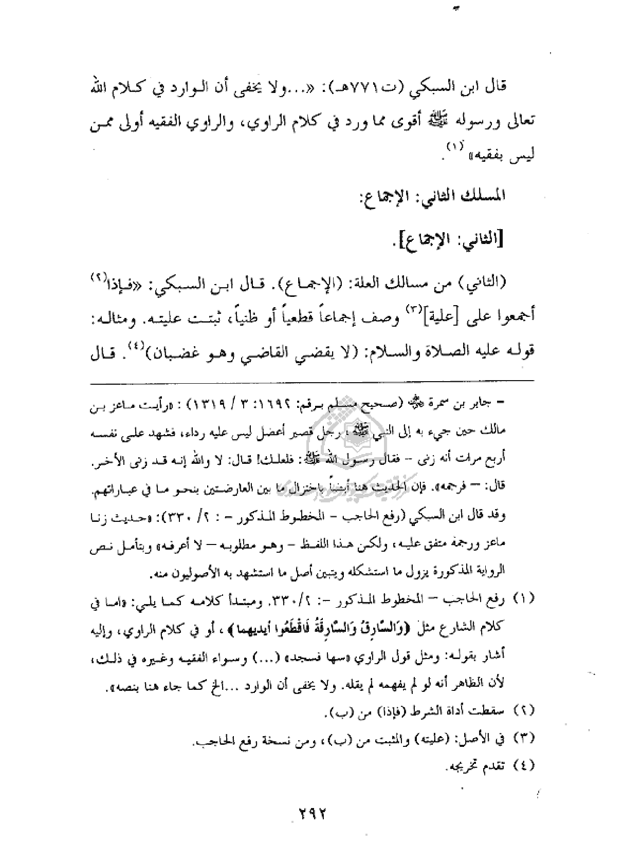 (¬١) رفع الحاجب - المخطوط المذكور -: ٢/ ٣٣٠. ومبتدأ كلامه كما يلي: «اما في كلام الشارع مثل وَالسّارِقُ وَالسّارِقَةُ فَاقْطَعُوا أَيْدِيَهُما، أو في كلام الراوي، وإليه أشار بقوله: ومثل قول الراوي «سها فسجد» (. . .) وسواء الفقيه وغيره في ذلك، لأن الظاهر أنه لو لم يفهمه لم يقله. ولا يخفى أن الوارد. . . الخ كما جاء هنا بنصه».