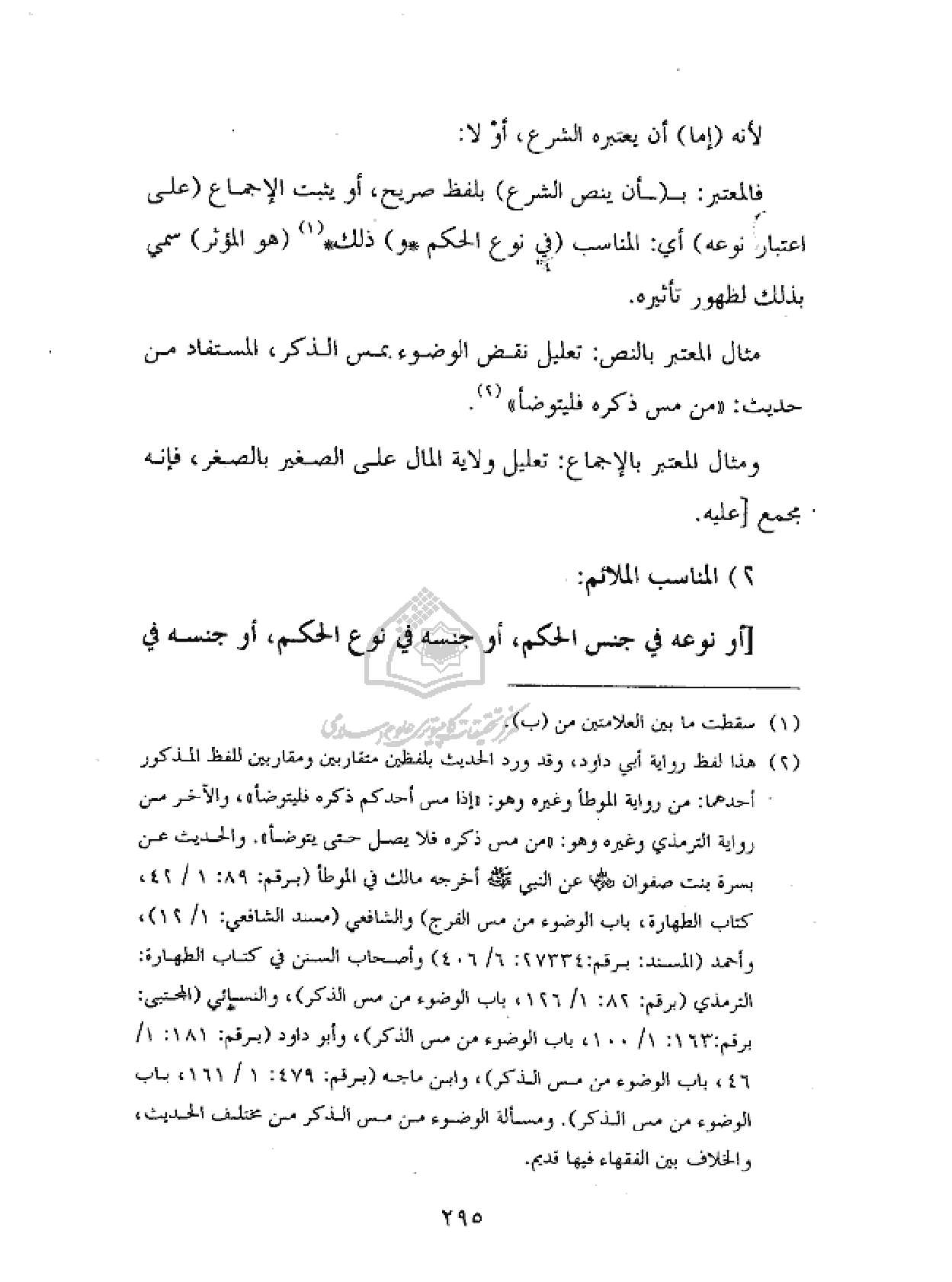 (¬٢) هذا لفظ رواية أبي داود، وقد ورد الحديث بلفظين متقاربين ومقاربين للفظ المذكور أحدهما: من رواية الموطأ وغيره وهو: «إذا مس أحدكم ذكره فليتوضأ»، والآخر من رواية الترمذي وغيره وهو: «من مس ذكره فلا يصل حتى يتوضأ». والحديث عن بسرة بنت صفوان رضي الله عنها عن النبي صلى الله عليه وسلم أخرجه مالك في الموطأ (برقم: ٨٩: ١/ ٤٢، كتاب الطهارة، باب الوضوء من مس الفرج) والشافعي (مسند الشافعي: ١/ ١٢)، وأحمد (المسند: برقم: ٢٧٣٣٤: ٦/ ٤٠٦) وأصحاب السنن في كتاب الطهارة: الترمذي (برقم: ٨٢: ١/ ١٢٦، باب الوضوء من مس الذكر)، والنسائي (المجتبى: برقم: ١٦٣: ١/ ١٠٠، باب الوضوء من مس الذكر)، وأبو داود (برقم: ١٨١: ١/ ٤٦، باب الوضوء من مس الذكر)، وابن ماجه (برقم: ٤٧٩: ١/ ١٦١، باب الوضوء من مس الذكر). ومسألة الوضوء من مس الذكر من مختلف الحديث، والخلاف بين الفقهاء فيها قديم.