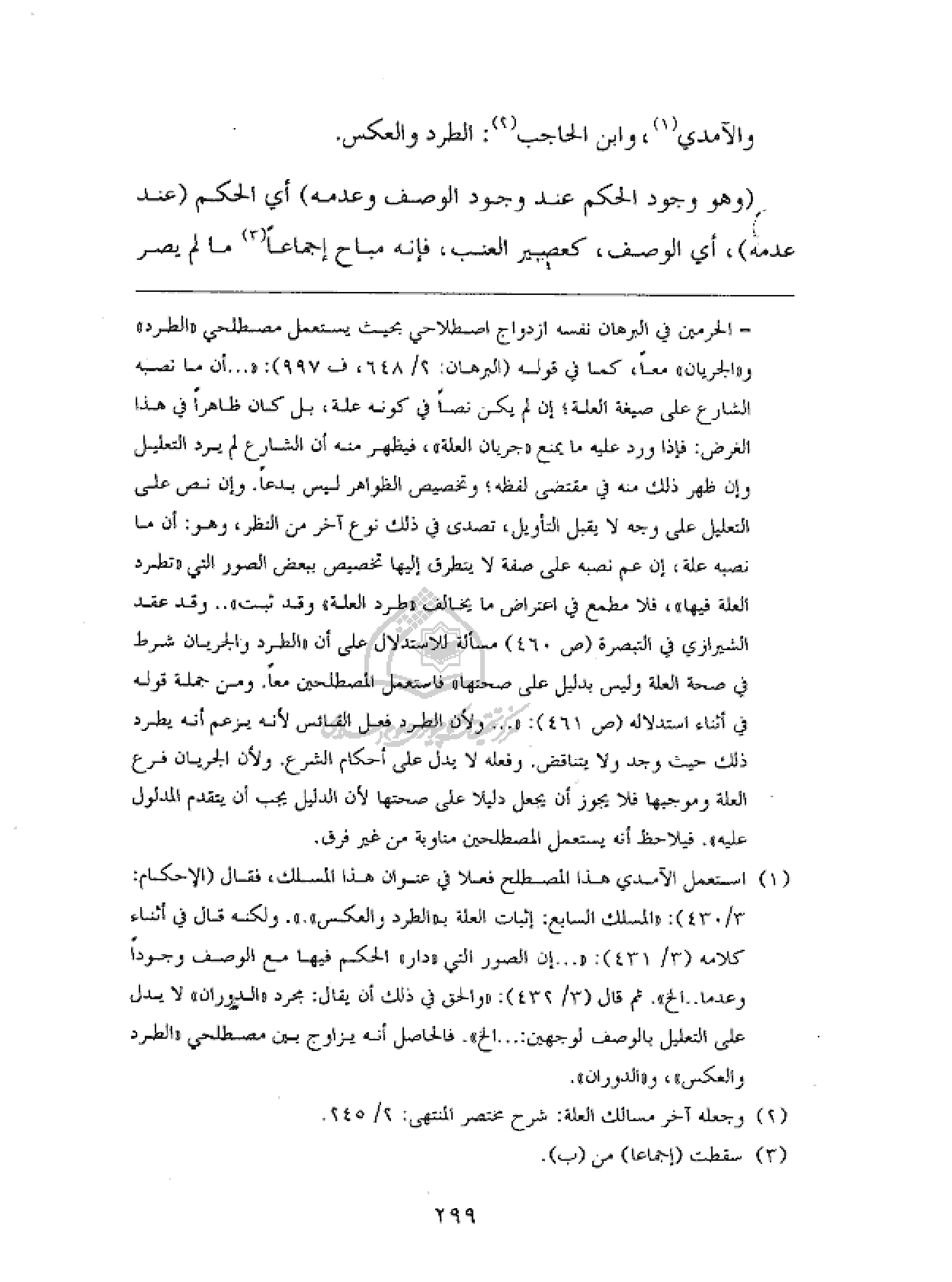 (¬١) استعمل الآمدي هذا المصطلح فعلا في عنوان هذا المسلك، فقال (الإحكام : ٣/ ٤٣٠) : «المسلك السابع : إثبات العلة ب «الطرد والعكس».». ولكنه قال في أثناء كلامه (٣/ ٤٣١) : «. . . إن الصور التي «دار» الحكم فيها مع الوصف وجودا وعدما. . الخ». ثم قال (٣/ ٤٣٢) : «والحق في ذلك أن يقال : مجرد «الدوران» لا يدل على التعليل بالوصف لوجهين : . . . الخ». فالحاصل أنه يزاوج بين مصطلحي «الطرد والعكس»، و «الدوران».