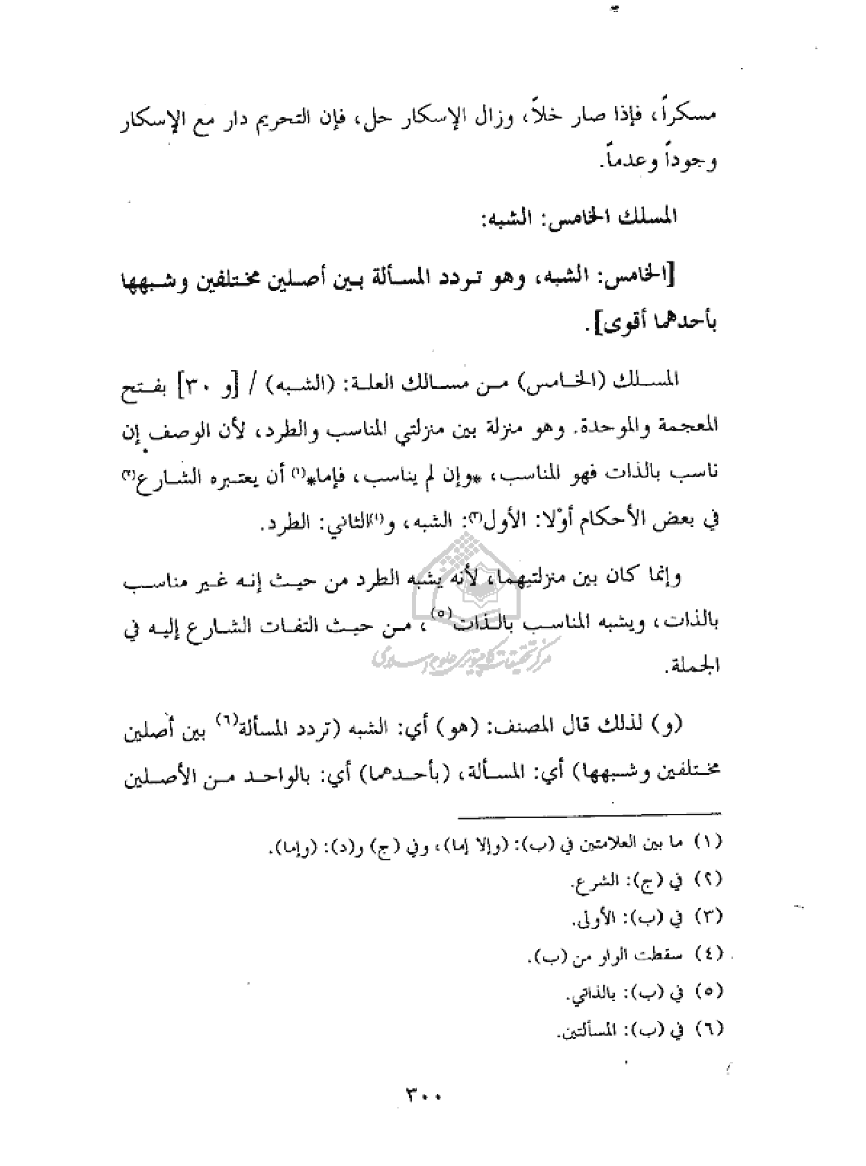 المسلك (الخامس) من مسالك العلة: (الشبه) / [و ٣٠] بفتح المعجمة والموحدة. وهو منزلة بين منزلتي المناسب والطرد، لأن الوصف إن ناسب بالذات فهو المناسب، * وإن لم يناسب، فإما * (¬١) أن يعتبره الشارع (¬٢) في بعض الأحكام أولا: الأول (¬٣): الشبه، و (¬٤) الثاني: الطرد.