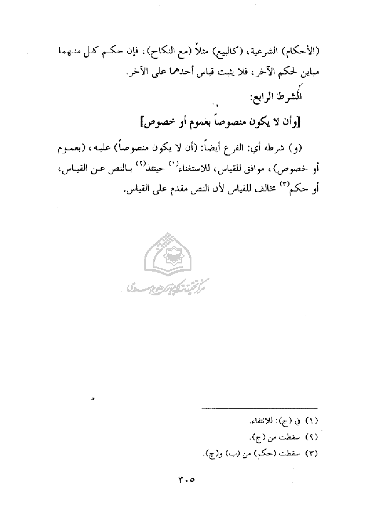 (و) شرطه أي: الفرع أيضا: (أن لا يكون منصوصا) عليه، (بعموم أو خصوص)، موافق للقياس، للاستغناء (¬١) حينئذ (¬٢) بالنص عن القياس، أو حكم (¬٣) مخالف للقياس لأن النص مقدم على القياس.
