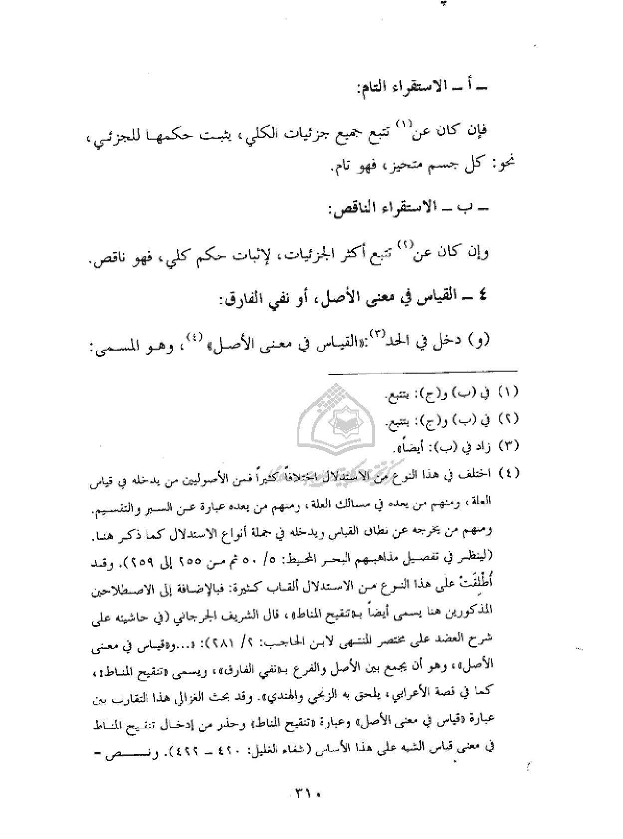 (¬٤) اختلف في هذا النوع من الاستدلال اختلافا كثيرا فمن الأصوليين من يدخله في قياس العلة، ومنهم من يعده في مسالك العلة، ومنهم من يعده عبارة عن السبر والتقسيم. ومنهم من يخرجه عن نطاق القياس ويدخله في جملة أنواع الاستدلال كما ذكر هنا. (لينظر في تفصيل مذاهبهم البحر المحيط: ٥/ ٥٠ ثم من ٢٥٥ إلى ٢٥٩). وقد أطلقت على هذا النوع من الاستدلال ألقاب كثيرة: فبالإضافة إلى الاصطلاحين المذكورين هنا يسمى أيضا ب «تنقيح المناط»، قال الشريف الجرجاني (في حاشيته على شرح العضد على مختصر المنتهى لابن الحاجب: ٢/ ٢٨١): «. . . و «قياس في معنى الأصل»، وهو أن يجمع بين الأصل والفرع ب «نفي الفارق»، ويسمى «تنقيح المناط»، كما في قصة الأعرابي، يلحق به الزنجي والهندي». وقد بحث الغزالي هذا التقارب بين عبارة «قياس في معنى الأصل» وعبارة «تنقيح المناط» وحذر من إدخال تنقيح المناط في معنى قياس الشبه على هذا الأساس (شفاء الغليل: ٤٢٠ - ٤٢٢). ونص -