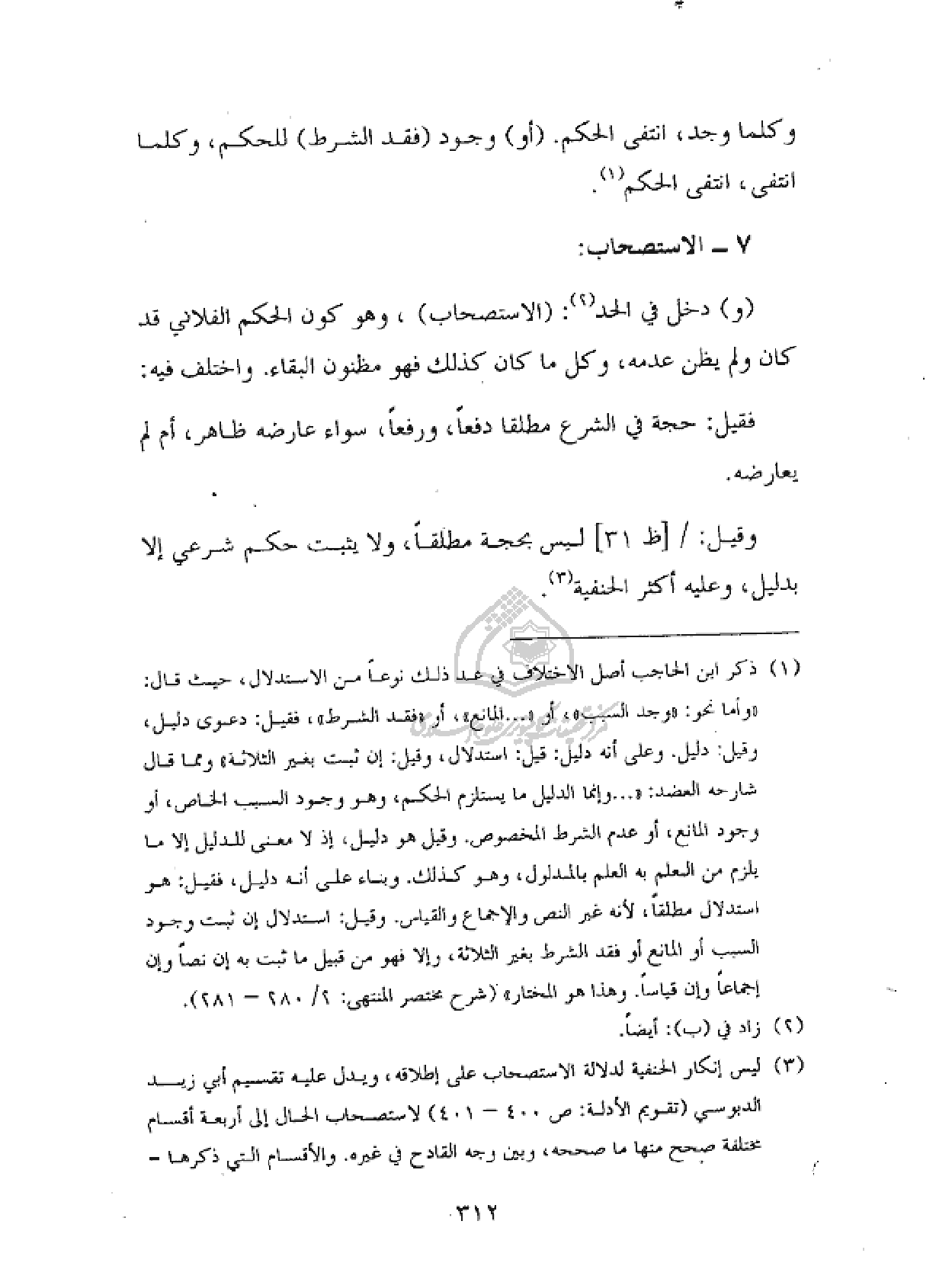 (¬٣) ليس إنكار الحنفية لدلالة الاستصحاب على إطلاقه، ويدل عليه تقسيم أبي زيد الدبوسي (تقويم الأدلة: ص ٤٠٠ - ٤٠١) لاستصحاب الحال إلى أربعة أقسام مختلفة صحح منها ما صححه، وبين وجه القادح في غيره. والأقسام التي ذكرها -