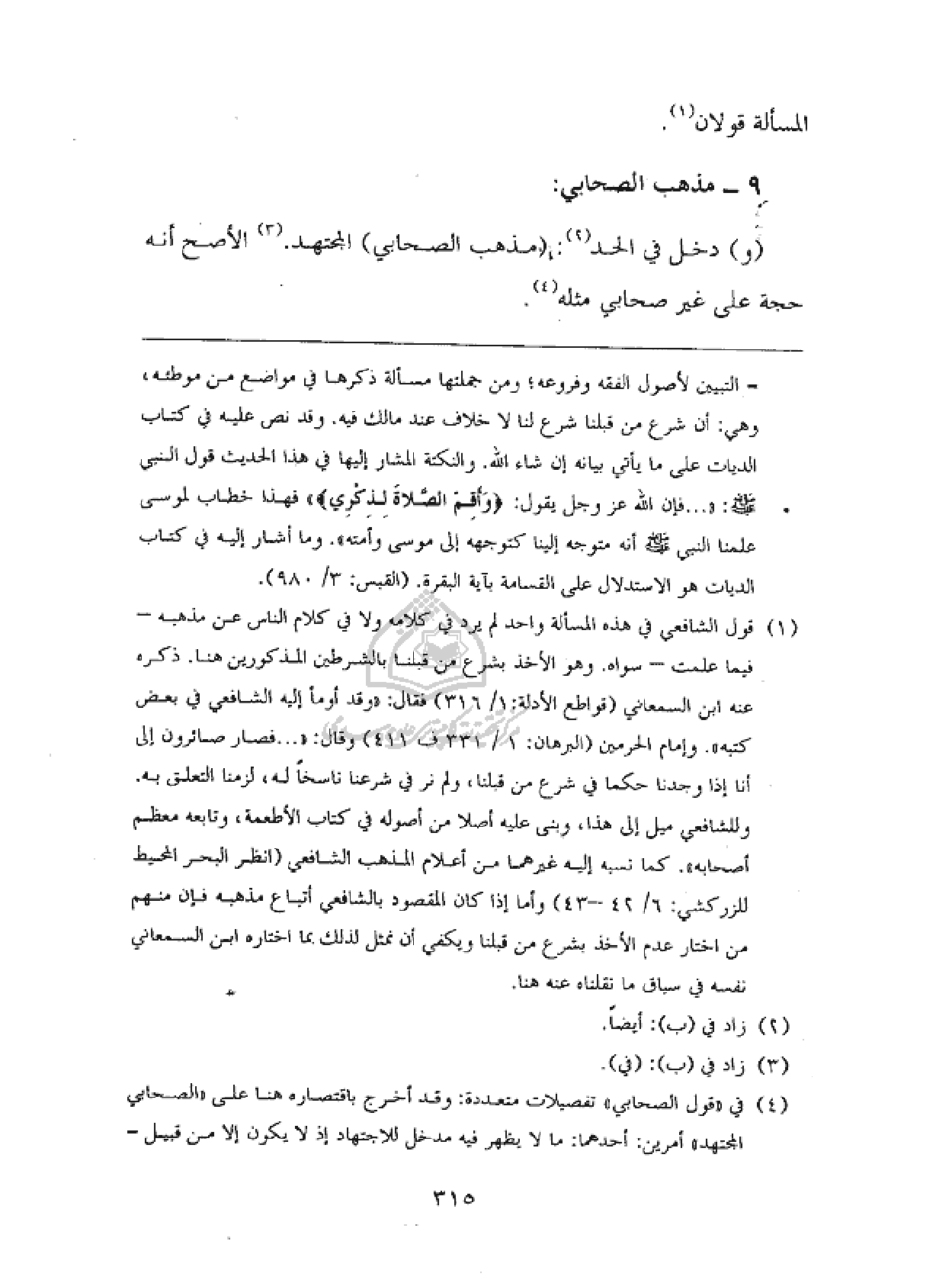 (¬١) قول الشافعي في هذه المسألة واحد لم يرد في كلامه ولا في كلام الناس عن مذهبه - فيما علمت - سواه. وهو الأخذ بشرع من قبلنا بالشرطين المذكورين هنا. ذكره عنه ابن السمعاني (قواطع الأدلة: ١/ ٣١٦) فقال: «وقد أومأ إليه الشافعي في بعض كتبه». وإمام الحرمين (البرهان: ١/ ٣٣١ ف ٤١١) وقال: «. . . فصار صائرون إلى أنا إذا وجدنا حكما في شرع من قبلنا، ولم نر في شرعنا ناسخا له، لزمنا التعلق به. وللشافعي ميل إلى هذا، وبنى عليه أصلا من أصوله في كتاب الأطعمة، وتابعه معظم أصحابه». كما نسبه إليه غيرهما من أعلام المذهب الشافعي (انظر البحر المحيط للزركشي: ٦/ ٤٢ - ٤٣) وأما إذا كان المقصود بالشافعي أتباع مذهبه فإن منهم من اختار عدم الأخذ بشرع من قبلنا ويكفي أن نمثل لذلك بما اختاره ابن السمعاني نفسه في سياق ما نقلناه عنه هنا.