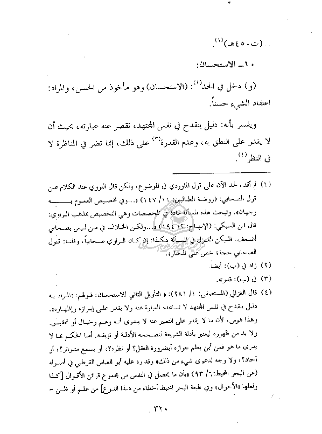 (¬٤) قال الغزالي (المستصفى: ١/ ٢٨١): «التأويل الثاني للاستحسان: قولهم: «المراد به دليل ينقدح في نفس المجتهد لا تساعده العبارة عنه ولا يقدر على إبرازه وإظهاره». وهذا هوس، لأن ما لا يقدر على التعبير عنه لا يدرى أنه وهم وخيال أو تحقيق. ولابد من ظهوره ليعتبر بأدلة الشريعة لتصححه الأدلة أو تزيفه. أما الحكم بما لا يدرى ما هو فمن أين يعلم جوازه أبضرورة العقل؟ أو نظره؟، أو بسمع متواتر؟، أو آحاد؟، ولا وجه لدعوى شيء من ذلك» وقد رد عليه أبو العباس القرطبي في أصوله (عن البحر المحيط: ٦/ ٩٣) «بأن ما يحصل في النفس من مجموع قرائن الأقوال [كذا ولعلها «الأحوال» وفي طبعة البحر المحيط أخطاء من هذا النوع] من علم أو ظن -