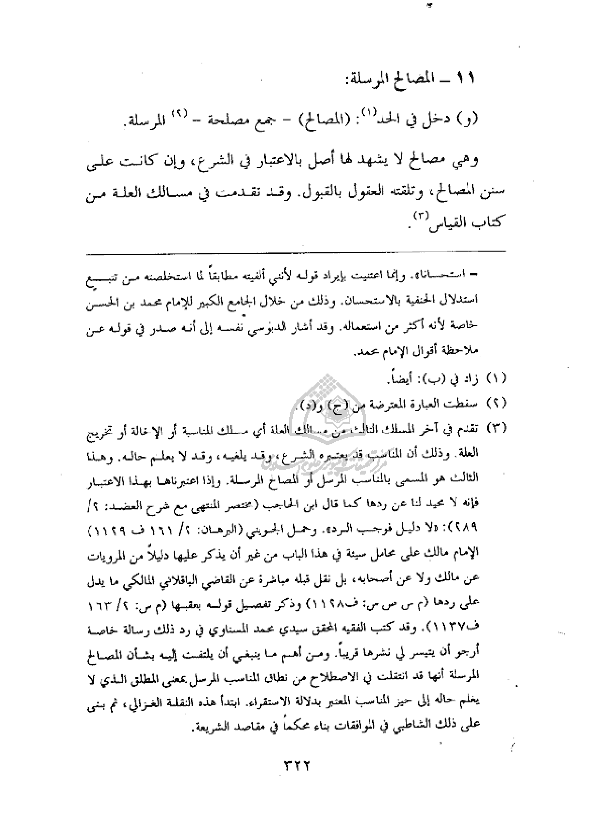 (¬٣) تقدم في آخر المسلك الثالث من مسالك العلة أي مسلك المناسبة أو الإخالة أو تخريج العلة. وذلك أن المناسب قد يعتبره الشرع، وقد يلغيه، وقد لا يعلم حاله. وهذا الثالث هو المسمى بالمناسب المرسل أو المصالح المرسلة. وإذا اعتبرناها بهذا الاعتبار فإنه لا محيد لنا عن ردها كما قال ابن الحاجب (مختصر المنتهى مع شرح العضد: ٢/ ٢٨٩): «لا دليل فوجب الرد». وحمل الجويني (البرهان: ٢/ ١٦١ ف ١١٢٩) الإمام مالك على محامل سيئة في هذا الباب من غير أن يذكر عليها دليلا من المرويات عن مالك ولا عن أصحابه، بل نقل قبله مباشرة عن القاضي الباقلاني المالكي ما يدل على ردها (م س ص س: ف ١١٢٨) وذكر تفصيل قوله بعقبها (م س: ٢/ ١٦٣ ف ١١٣٧). وقد كتب الفقيه المحقق سيدي محمد المسناوي في رد ذلك رسالة خاصة أرجو أن يتيسر لي نشرها قريبا. ومن أهم ما ينبغي أن يلتفت إليه بشأن المصالح المرسلة أنها قد انتقلت في الاصطلاح من نطاق المناسب المرسل بمعنى المطلق الذي لا يعلم حاله إلى حيز المناسب المعتبر بدلالة الاستقراء. ابتدأ هذه النقلة الغزالي، ثم بنى على ذلك الشاطبي في الموافقات بناء محكما في مقاصد الشريعة.