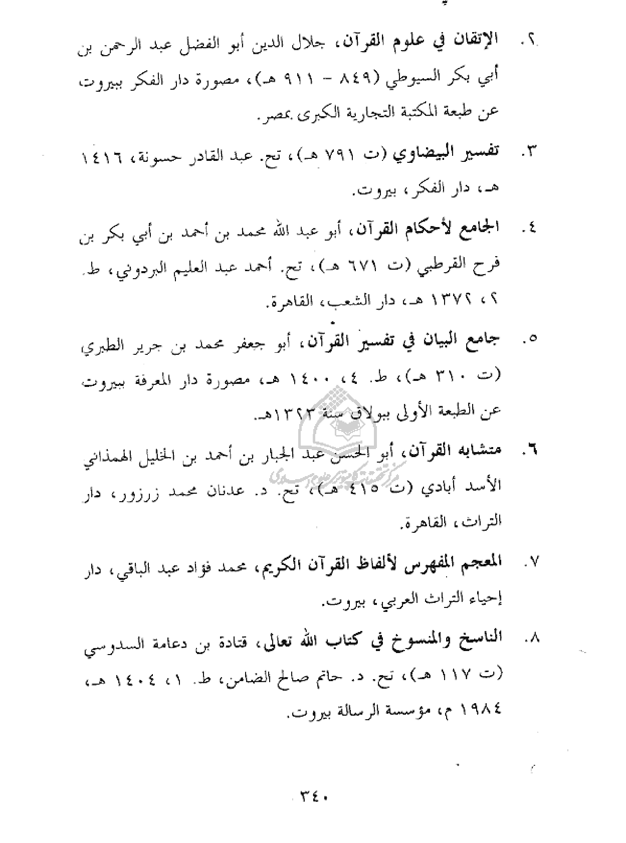 ٢ - الإتقان في علوم القرآن، جلال الدين أبو الفضل عبد الرحمن بن أبي بكر السيوطي (٨٤٩ - ٩١١ هـ)، مصورة دار الفكر ببيروت عن طبعة المكتبة التجارية الكبرى بمصر.