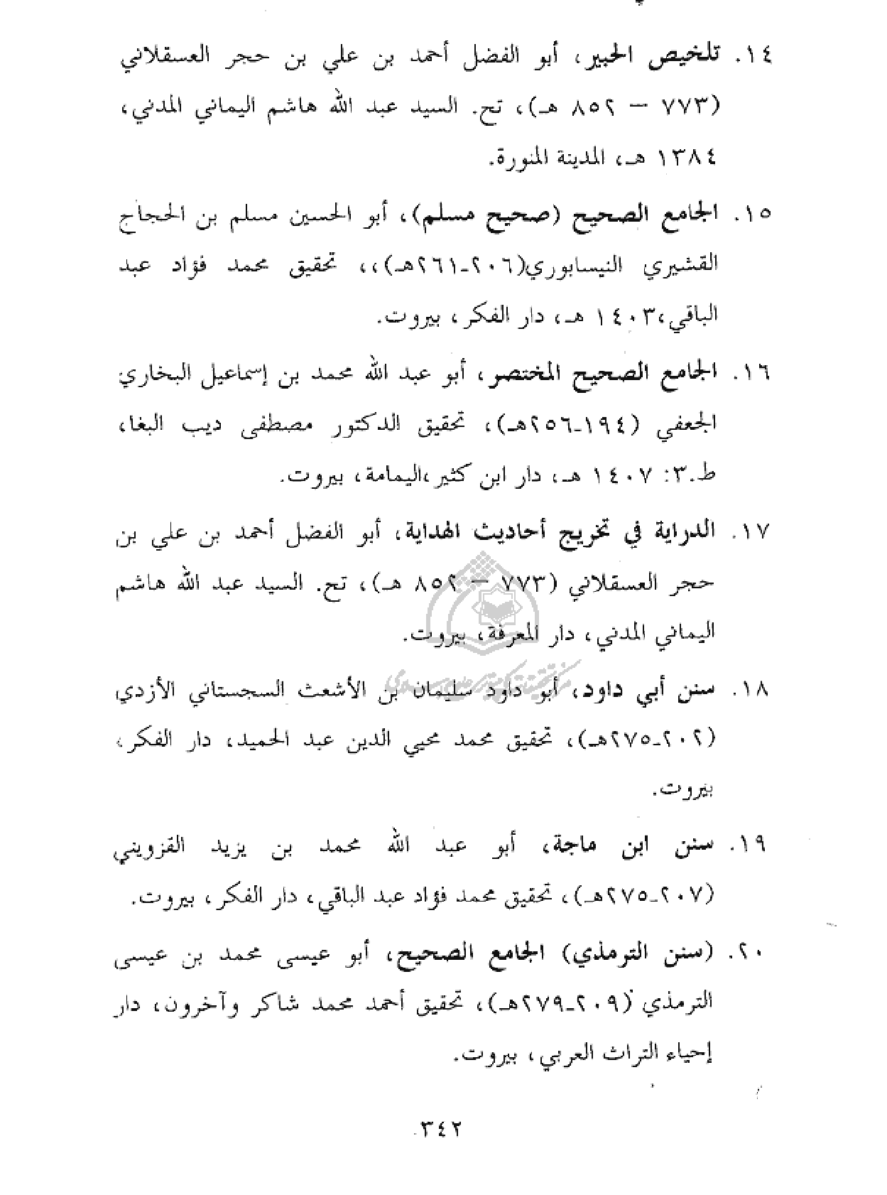 ١٥ - الجامع الصحيح (صحيح مسلم)، أبو الحسين مسلم بن الحجاج القشيري النيسابوري (٢٠٦ - ٢٦١ هـ)، تحقيق محمد فؤاد عبد الباقي، ١٤٠٣ هـ، دار الفكر، بيروت.