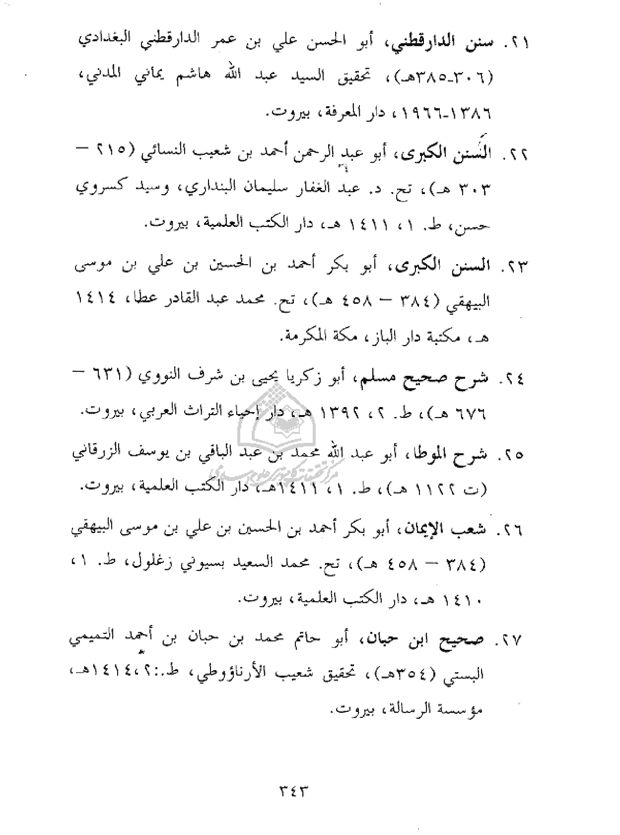 ٢٦ - شعب الإيمان، أبو بكر أحمد بن الحسين بن علي بن موسى البيهقي (٣٨٤ - ٤٥٨ هـ)، تح. محمد السعيد بسيوني زغلول، ط.١، ١٤١٠ هـ، دار الكتب العلمية، بيروت.