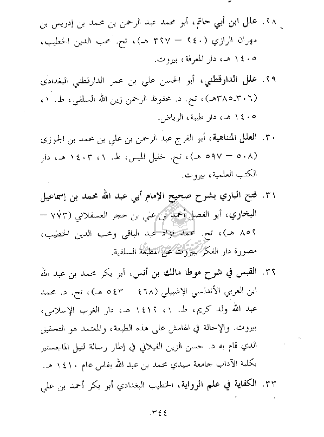 ٢٨ - علل ابن أبي حاتم، أبو محمد عبد الرحمن بن محمد بن إدريس بن مهران الرازي (٢٤٠ - ٣٢٧ هـ)، تح. محب الدين الخطيب، ١٤٠٥ هـ، دار المعرفة، بيروت.