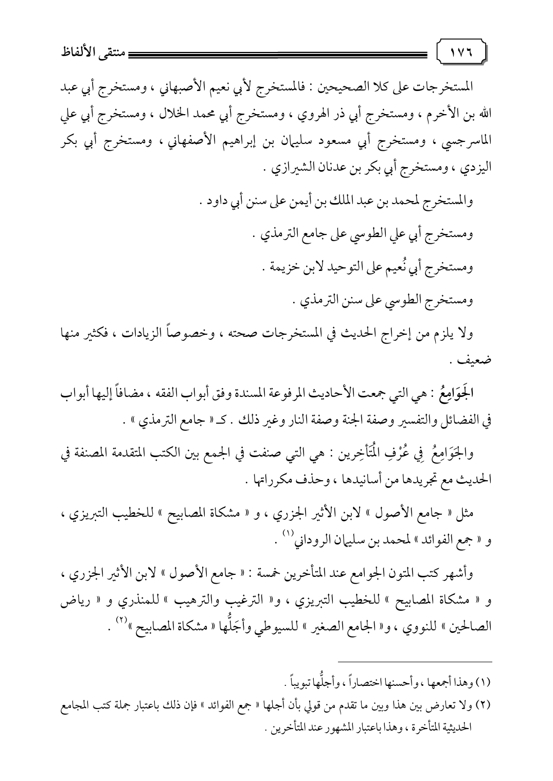 وأشهر كتب المتون الجوامع عند المتأخرين خمسة: "جامع الأصول" لابن الأثير الجزري، و "مشكاة المصابيح" للخطيب التبريزي، و"الترغيب والترهيب" للمنذري و "رياض الصالحين" للنووي، و "الجامع الصغير" للسيوطي وأجَلُّها "مشكاة المصابيح" (٢).