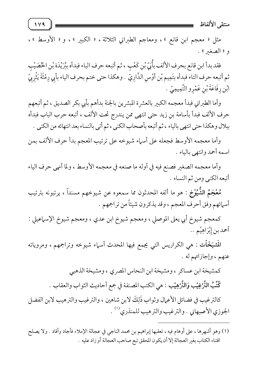 مثل "معجم ابن قانع"، ومعاجم الطبراني الثلاثة، "الكبير"، و "الأوسط"، و "الصغير".