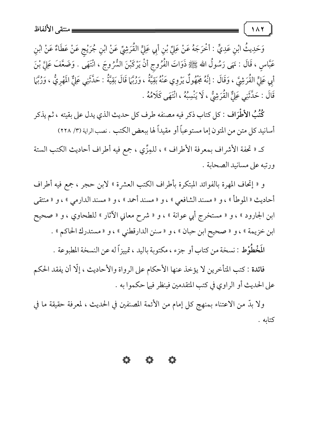 وَحَدِيثُ ابْنِ عَدِيٍّ: أخْرَجَهُ عَنْ عَلِيِّ بْنِ أبِي عَلِيٍّ القُرَشِيِّ عَنْ ابْنِ جُرَيْجٍ عَنْ عَطَاءٌ عَنْ ابْنِ عَبَّاسٍ، قَالَ: نَهَى رَسُولُ الله صلى الله عليه وسلم ذَوَاتَ الفُرُوجِ أنْ يَرْكَبْنَ السُّرُوجَ، انْتَهَى. وَضَعَّفَ عَلِيَّ بْنَ أبِي عَلِيٍّ القُرَشِيَّ، وَقَالَ: إنَّهُ مَجْهُولٌ يَرْوِي عَنْهُ بَقِيَّةُ، وَرُبَّمَا قَالَ بَقِيَّةُ: حَدَّثَنِي عَلِيٌّ المَهْرِيُّ، وَرُبَّمَا قَالَ: حَدَّثَنِي عَلِيٌّ القُرَشِيُّ، لَا يَنْسِبُهُ، انْتَهَى كَلَامُهُ.