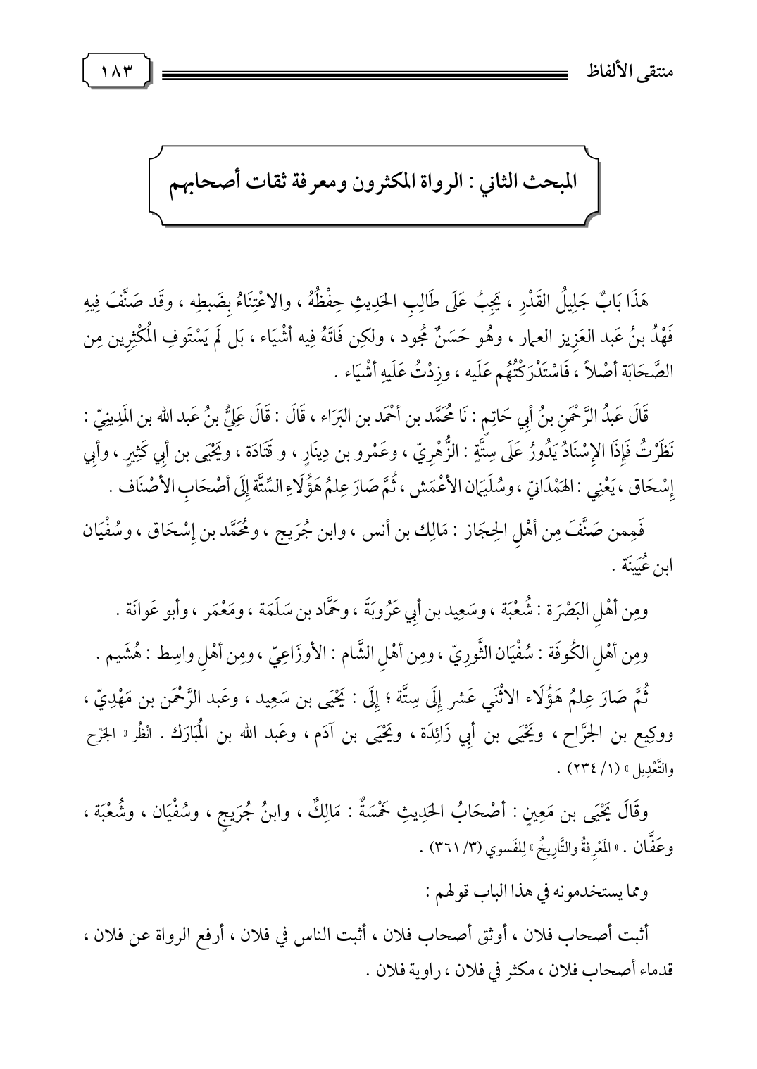 هَذَا بَابٌ جَلِيلُ القَدْرِ، يَجِبُ عَلَى طَالِبِ الحَدِيثِ حِفْظُهُ، والاعْتِنَاءُ بِضَبطِه، وقَد صَنَّفَ فِيهِ فَهْدُ بنُ عَبد العَزِيز العمار، وهُو حَسَنٌ مُجود، ولكِن فَاتَهُ فِيه أشْيَاء، بَل لَم يَسْتَوفِ المُكْثِرِين مِن الصَّحَابَة أصْلًا، فَاسْتَدْرَكْتُهُم عَلَيه، وزِدْتُ عَلَيهِ أشْيَاء.