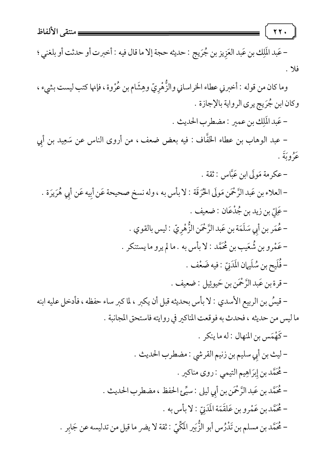 - عَبد المَلِك بن عَبد العَزِيز بن جُرَيج: حديثه حجة إلا ما قال فيه: أخبرت أو حدثت أو بلغني؛ فلا.
