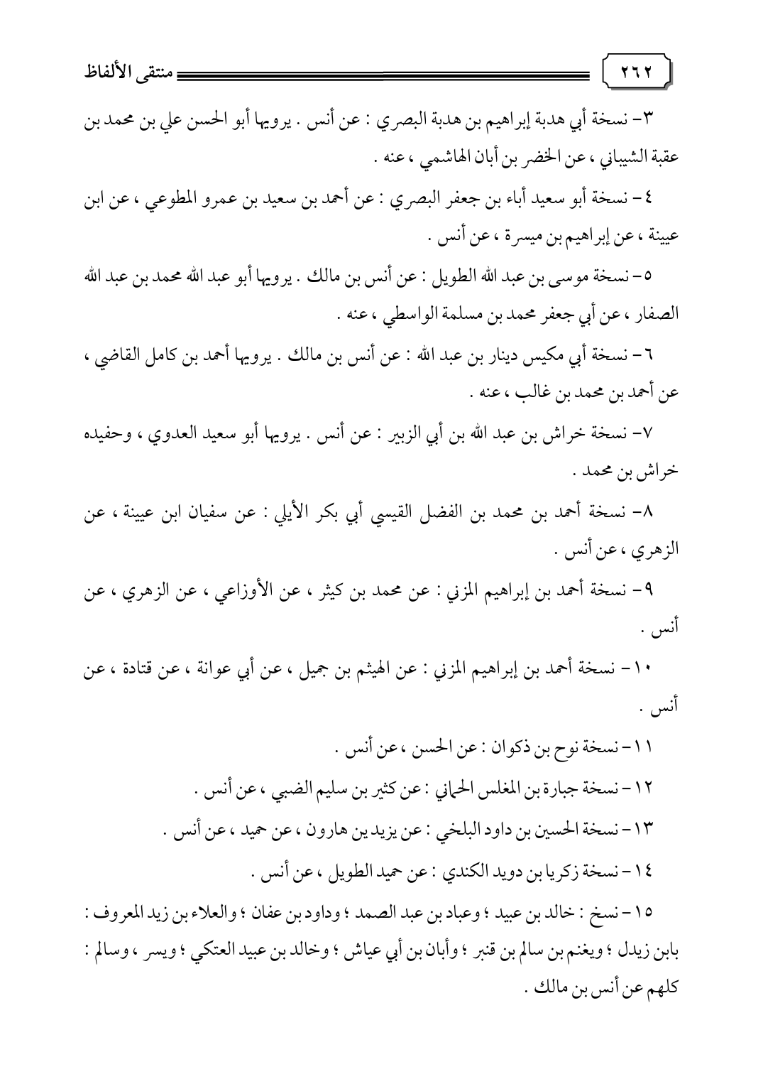 ١٥ - نسخ: خالد بن عبيد؛ وعباد بن عبد الصمد؛ وداود بن عفان؛ والعلاء بن زيد المعروف: بابن زيدل؛ ويغنم بن سالم بن قنبر؛ وأبان بن أبي عياش؛ وخالد بن عبيد العتكي؛ ويسر، وسالم: كلهم عن أنس بن مالك.