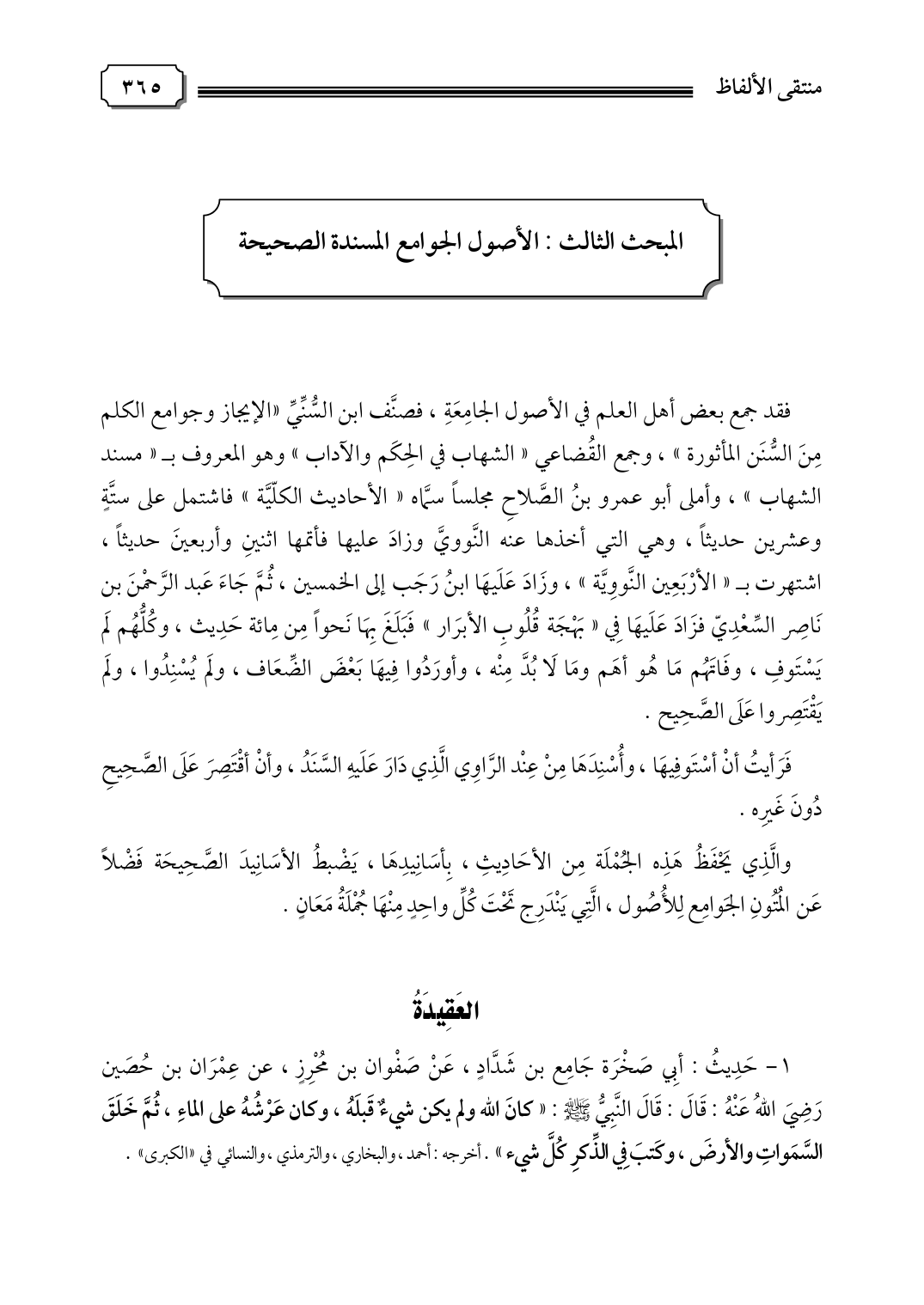 ١ - حَدِيثُ: أبِي صَخْرَة جَامِع بن شَدَّادٍ، عَنْ صَفْوان بن مُحْرِزٍ، عن عِمْرَان بن حُصَين رَضِيَ اللهُ عَنْهُ: قَالَ: قَالَ النَّبِيُّ صلى الله عليه وسلم: "كانَ الله ولم يكن شيءٌ قَبلَهُ، وكان عَرْشُهُ على الماءِ، ثُمَّ خَلَقَ السَّمَواتِ والأرضَ، وكَتبَ فِي الذِّكرِ كُلَّ شيء" أخرجه: أحمد، والبخاري، والترمذي، والنسائي في "الكبرى".