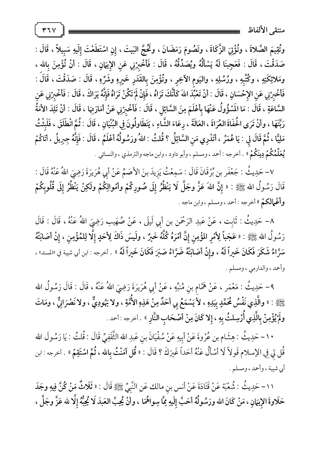 وتُقِيمَ الصَّلاةَ، وتُؤْتِيَ الزَّكَاةَ، وتَصُومَ رَمَضَانَ، وتَحُجَّ البَيتَ، إِنِ اسْتَطَعْتَ إِلَيهِ سَبِيلًا، قَالَ: صَدَقْتَ، قَالَ: فَعَجِبنَا لَهُ يَسْألُهُ ويُصَدِّقُهُ، قَالَ: فَأخْبِرْنِي عَنِ الإِيمَانِ، قَالَ: أنْ تُؤْمِنَ بِاللهِ، ومَلائِكَتِهِ، وكُتُبِهِ، ورُسُلِهِ، واليَومِ الآخِرِ، وتُؤْمِنَ بِالقَدَرِ خَيرِهِ وشَرِّهِ، قَالَ: صَدَقْتَ، قَالَ: فَأخْبِرْنِي عَنِ الإِحْسَانِ، قَالَ: أنْ تَعْبُدَ اللهَ كَأنَّكَ تَرَاهُ، فَإِنْ لَمْ تَكُنْ تَرَاهُ فَإِنَّهُ يَرَاكَ، قَالَ: فَأخْبِرْنِي عَنِ السَّاعَةِ، قَالَ: مَا المَسْؤُولُ عَنْهَا بِأعْلَمَ مِنَ السَّائِلِ، قَالَ: فَأخْبِرْنِي عَنْ أمَارَتِهَا، قَالَ: أنْ تَلِدَ الأمَةُ رَبَّتَهَا، وأنْ تَرَى الحُفَاةَ العُرَاةَ، العَالَةَ، رِعَاءَ الشَّاءِ، يَتَطَاولُونَ فِي البُنْيَانِ، قَالَ: ثُمَّ انْطَلَقَ، فَلَبِثْتُ مَلِيًّا، ثُمَّ قَالَ لِي: يَا عُمَرُ، أتَدْرِي مَنِ السَّائِلُ؟ قُلتُ: اللهُ ورَسُولُهُ أعْلَمُ، قَالَ: فَإِنَّهُ جِبرِيلُ، أتَاكُمْ يُعَلِّمُكُمْ دِينَكُمْ". أخرجه: أحمد، ومسلم، وأبو داود، وابن ماجه والترمذي، والنسائي.