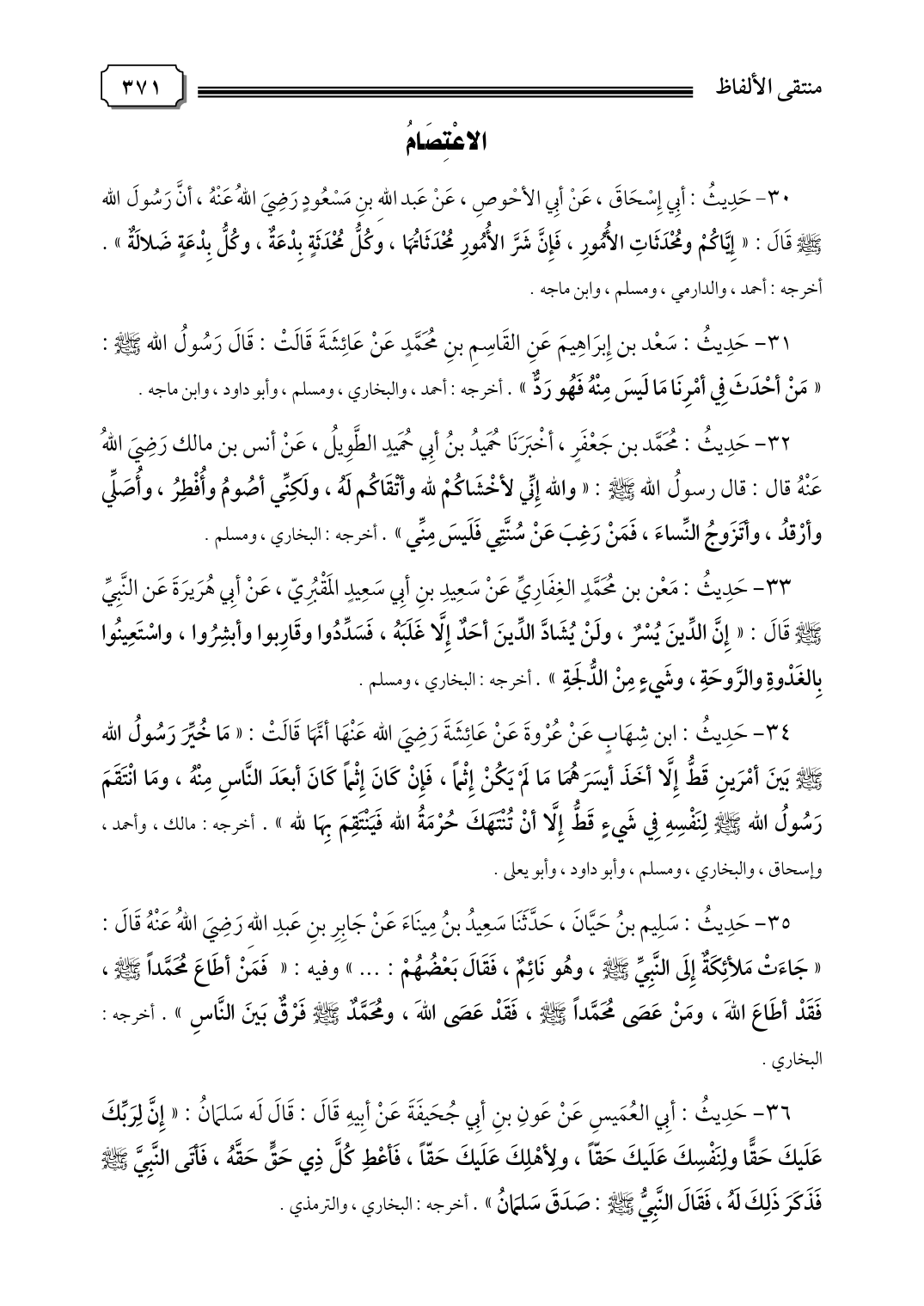 ٣٠ - حَدِيثُ: أبِي إِسْحَاقَ، عَنْ أبِي الأحْوصِ، عَنْ عَبد اللهِ بنِ مَسْعُودٍ رَضِيَ اللهُ عَنْهُ، أنَّ رَسُولَ الله صلى الله عليه وسلم قَالَ: "إِيَّاكُمْ ومُحْدَثَاتِ الأُمُورِ، فَإِنَّ شَرَّ الأُمُورِ مُحْدَثَاتُهَا، وكُلُّ مُحْدَثَةٍ بِدْعَةٌ، وكُلُّ بِدْعَةٍ ضَلالَةٌ" أخرجه: أحمد، والدارمي، ومسلم، وابن ماجه.