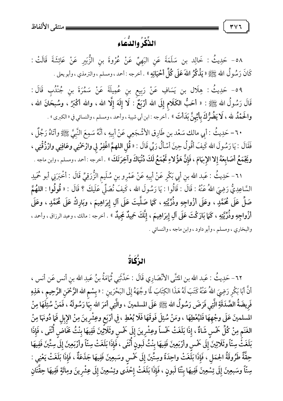 ٦٢ - حَدِيثُ: عَبد الله بن المثنَّى الأنْصَارِي قَالَ: حَدَّثَنِي ثُمَامَةُ بنُ عَبدِ الله بنِ أنس عَن أنس، أنَّ أبَا بَكْرٍ رَضِيَ اللهُ عَنْهُ كَتَبَ لَهُ هَذَا الكِتَابَ لّما وجَّهَهُ إِلَى البَحْرَين: "بِسْمِ الله الرَّحْمَنِ الرَّحِيمِ، هَذِهِ فَرِيضَةُ الصَّدَقَةِ الَّتِي فَرَضَ رَسُولُ الله صلى الله عليه وسلم عَلَى المسلمينَ، والَّتِي أمَرَ الله بِهَا رَسُولَهُ، فَمَنْ سُئِلَهَا مِنْ المسلمينَ عَلَى وجْهِهَا فَليُعْطِهَا، ومَنْ سُئِلَ فَوقَهَا فَلَا يُعْطِ، فِي أرْبَعٍ وعِشْرِينَ مِنْ الإِبِلِ فَمَا دُونَهَا مِنْ الغَنَمِ مِنْ كُلِّ خَمْسٍ شَاةٌ، إِذَا بَلَغَتْ خَمْسًا وعِشْرِينَ إِلَى خَمْسٍ وثَلَاثِينَ فَفِيهَا بِنْتُ مَخَاضٍ أُنْثَى، فَإِذَا بَلَغَتْ سِتًّا وثَلَاثِينَ إِلَى خَمْسٍ وأرْبَعِينَ فَفِيهَا بِنْتُ لَبونٍ أُنْثَى، فَإِذَا بَلَغَتْ سِتًّا وأرْبَعِينَ إِلَى سِتِّينَ فَفِيهَا حِقَّةٌ طَرُوقَةُ الجمَلِ، فَإِذَا بَلَغَتْ واحِدَةً وسِتِّينَ إِلَى خَمْسٍ وسَبعِينَ فَفِيهَا جَذَعَةٌ، فَإِذَا بَلَغَتْ يَعْنِي: سِتًّا وسَبعِينَ إِلَى تِسْعِينَ فَفِيهَا بِنْتَا لَبونٍ، فَإِذَا بَلَغَتْ إِحْدَى وتِسْعِينَ إِلَى عِشْرِينَ ومِائَةٍ فَفِيهَا حِقَّتَانِ