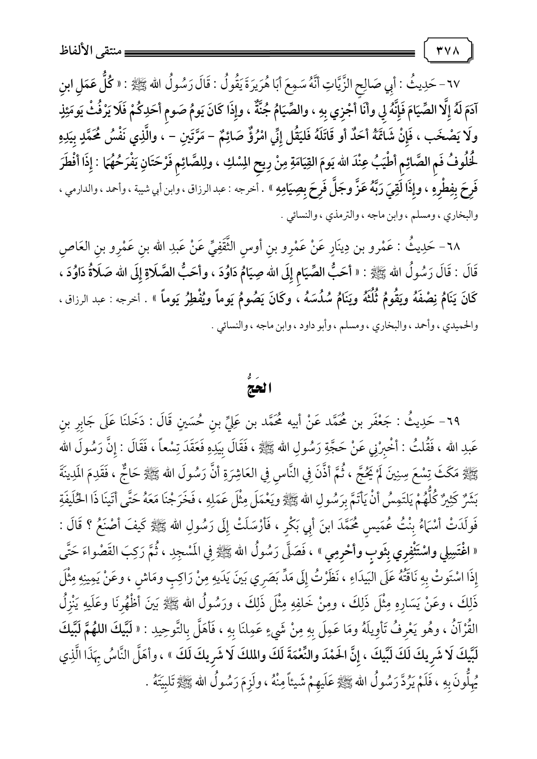 ٦٩ - حَدِيثُ: جَعْفَر بن مُحَمَّد عَنْ أبيه مُحَمَّد بن عَلِيِّ بنِ حُسَينٍ قَالَ: دَخَلنَا عَلَى جَابِرِ بنِ عَبدِ الله، فَقُلتُ: أخْبِرْنِي عَنْ حَجَّةِ رَسُولِ الله صلى الله عليه وسلم، فَقَالَ بِيَدِهِ فَعَقَدَ تِسْعًا، فَقَالَ: إِنَّ رَسُولَ الله صلى الله عليه وسلم مَكَثَ تِسْعَ سِنِينَ لَمْ يَحُجَّ، ثُمَّ أذَّنَ فِي النَّاسِ فِي العَاشِرَةِ أنَّ رَسُولَ الله صلى الله عليه وسلم حَاجٌّ، فَقَدِمَ المَدِينَةَ بَشَرٌ كَثِيرٌ كُلُّهُمْ يَلتَمِسُ أنْ يَأتَمَّ بِرَسُولِ الله صلى الله عليه وسلم ويَعْمَلَ مِثْلَ عَمَلِهِ، فَخَرَجْنَا مَعَهُ حَتَّى أتَينَا ذَا الحُلَيفَةِ فَولَدَتْ أسْمَاءُ بِنْتُ عُمَيسٍ مُحَمَّدَ بنَ أبِي بَكْرٍ، فَأرْسَلَتْ إِلَى رَسُولِ الله صلى الله عليه وسلم كَيفَ أصْنَعُ؟ قَالَ: "اغْتَسِلي واسْتَثْفِرِي بِثَوبٍ وأحْرِمِي"، فَصَلَّى رَسُولُ الله صلى الله عليه وسلم فِي المَسْجِدِ، ثُمَّ رَكِبَ القَصْواءَ حَتَّى، إِذَا اسْتَوتْ بِهِ نَاقَتُهُ عَلَى البَيدَاءِ، نَظَرْتُ إِلَى مَدِّ بَصَرِي بَينَ يَدَيهِ مِنْ رَاكِبٍ ومَاشٍ، وعَنْ يَمِينِهِ مِثْلَ ذَلِكَ، وعَنْ يَسَارِهِ مِثْلَ ذَلِكَ، ومِنْ خَلفِهِ مِثْلَ ذَلِكَ، ورَسُولُ الله صلى الله عليه وسلم بَينَ أظْهُرِنَا وعَلَيهِ يَنْزِلُ القُرْآنُ، وهُو يَعْرِفُ تَأوِيلَهُ ومَا عَمِلَ بِهِ مِنْ شَيءٍ عَمِلنَا بِهِ، فَأهَلَّ بِالتَّوحِيدِ: "لَبَّيكَ اللهُمَّ لَبَّيكَ لَبَّيكَ لَا شَرِيكَ لَكَ لَبَّيكَ، إِنَّ الحَمْدَ والنِّعْمَةَ لَكَ والملكَ لَا شَرِيكَ لَكَ"، وأهَلَّ النَّاسُ بِهَذَا الَّذِي، يُهِلُّونَ بِهِ، فَلَمْ يَرُدَّ رَسُولُ الله صلى الله عليه وسلم عَلَيهِمْ شَيئًا مِنْهُ، ولَزِمَ رَسُولُ الله صلى الله عليه وسلم تَلبِيَتَهُ.