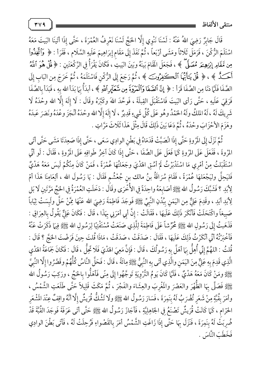 قَالَ جَابِرٌ رَضِيَ اللهُ عَنْهُ: لَسْنَا نَنْوِي إِلَّا الحَجَّ لَسْنَا نَعْرِفُ العُمْرَةَ، حَتَّى إِذَا أتَينَا البَيتَ مَعَهُ اسْتَلَمَ الرُّكْنَ، فَرَمَلَ ثَلَاثًا ومَشَى أرْبَعًا، ثُمَّ نَفَذَ إِلَى مَقَامِ إِبرَاهِيمَ عَلَيهِ السَّلَام، فَقَرَأ {وَاتَّخِذُوا مِنْ مَقَامِ إِبْرَاهِيمَ مُصَلًّى}، فَجَعَلَ الَمقَامَ بَينَهُ وبَينَ البَيتِ، فَكَانَ يَقْرَأُ فِي الرَّكْعَتَينِ: {قُلْ هُوَ اللَّهُ أَحَدٌ}، {قُلْ يَاأَيُّهَا الْكَافِرُونَ}، ثُمَّ رَجَعَ إِلَى الرُّكْنِ فَاسْتَلَمَهُ، ثُمَّ خَرَجَ مِن البَابِ إِلَى الصَّفَا فَلَمَّا دَنَا مِن الصَّفَا قَرَأ: {إِنَّ الصَّفَا وَالْمَرْوَةَ مِنْ شَعَائِرِ اللَّهِ}، أبدَأُ بِمَا بَدَأ الله بِهِ، فَبَدَأ بِالصَّفَا فَرَقِيَ عَلَيهِ، حَتَّى رَأى البَيتَ فَاسْتَقْبَلَ القِبلَةَ، فَوحَّدَ اللهَ وكَبَّرَهُ وقَالَ: لَا إِلَهَ إِلَّا الله وحْدَهُ لَا شَرِيكَ لَهُ، لَهُ الملكُ ولَهُ الحَمْدُ وهُو عَلَى كُلِّ شَيءٍ قَدِيرٌ، لَا إِلَهَ إِلَّا الله وحْدَهُ أنْجَزَ وعْدَهُ ونَصَرَ عَبدَهُ وهَزَمَ الأحْزَابَ وحْدَهُ، ثُمَّ دَعَا بَينَ ذَلِكَ قَالَ مِثْلَ هَذَا ثَلَاثَ مَرَّاتٍ. ثُمَّ نَزَلَ إِلَى المَرْوةِ حَتَّى إِذَا انْصَبَّتْ قَدَمَاهُ فِي بَطْنِ الوادِي سَعَى، حَتَّى إِذَا صَعِدَتَا مَشَى حَتَّى أتَى المرْوةَ، فَفَعَلَ عَلَى المرْوةِ كَمَا فَعَلَ عَلَى الصَّفَا، حَتَّى إِذَا كَانَ آخِرُ طَوافِهِ عَلَى المَرْوةِ، فَقَالَ: لَو أنِّي اسْتَقْبَلتُ مِنْ أمْرِي مَا اسْتَدْبَرْتُ لَمْ أسُقِ الهَدْيَ وجَعَلتُهَا عُمْرَةً، فَمَنْ كَانَ مِنْكُمْ لَيسَ مَعَهُ هَدْيٌ فَليَحِلَّ وليَجْعَلهَا عُمْرَةً، فَقَامَ سُرَاقَةُ بنُ مالك بنِ جُعْشُمٍ فَقَالَ: يَا رَسُولَ الله، ألِعَامِنَا هَذَا أمْ لِأبَدٍ؟ فَشَبَّكَ رَسُولُ الله صلى الله عليه وسلم أصَابِعَهُ واحِدَةً فِي الأُخْرَى وقَالَ: دَخَلَتِ العُمْرَةُ فِي الحَجِّ مَرَّتَينِ لَا بَل لِأبَدٍ أبَدٍ، وقَدِمَ عَلِيٌّ مِن اليَمَنِ بِبُدْنِ النَّبِيِّ صلى الله عليه وسلم فَوجَدَ فَاطِمَةَ رَضِيَ الله عَنْهَا مِمَّنْ حَلَّ ولَبِسَتْ ثِيَابًا صَبِيغًا واكْتَحَلَتْ فَأنْكَرَ ذَلِكَ عَلَيهَا، فَقَالَتْ: إِنَّ أبِي أمَرَنِي بِهَذَا، قَالَ: فَكَانَ عَلِيٌّ يَقُولُ بِالعِرَاقِ: فَذَهَبتُ إِلَى رَسُولِ الله صلى الله عليه وسلم مُحَرِّشًا عَلَى فَاطِمَةَ لِلَّذِي صَنَعَتْ مُسْتَفْتِيًا لِرَسُولِ الله صلى الله عليه وسلم فِيمَا ذَكَرَتْ عَنْهُ فَأخْبَرْتُهُ أنِّي أنْكَرْتُ ذَلِكَ عَلَيهَا، فَقَالَ: صَدَقَتْ، صَدَقَتْ، مَاذَا قُلتَ حِينَ فَرَضْتَ الحَجَّ؟ قَالَ: قُلتُ: اللهُمَّ إِنِّي أُهِلُّ بِمَا أهَلَّ بِهِ رَسُولُكَ، قَالَ: فَإِنَّ مَعِيَ الهَدْيَ فَلَا تَحِلُّ، قَالَ: فَكَانَ جَمَاعَةُ الهَدْيِ الَّذِي قَدِمَ بِهِ عَلِيٌّ مِنَ اليَمَنِ والَّذِي أتَى بِهِ النَّبِيُّ صلى الله عليه وسلم مِائَةً، قَالَ: فَحَلَّ النَّاسُ كُلُّهُمْ وقَصَّرُوا إِلَّا النَّبِيَّ صلى الله عليه وسلم ومَنْ كَانَ مَعَهُ هَدْيٌ، فَلَمَّا كَانَ يَومُ التَّرْوِيَةِ تَوجَّهُوا إِلَى مِنًى فَأهَلُّوا بِالحَجِّ، ورَكِبَ رَسُولُ الله صلى الله عليه وسلم فَصَلَّى بِهَا الظُّهْرَ والعَصْرَ والمَغْرِبَ والعِشَاءَ والفَجْرَ، ثُمَّ مَكَثَ قَلِيلًا حَتَّى طَلَعَتِ الشَّمْسُ، وأمَرَ بِقُبَّةٍ مِنْ شَعَرٍ تُضْرَبُ لَهُ بِنَمِرَةَ، فَسَارَ رَسُولُ الله صلى الله عليه وسلم ولَا تَشُكُّ قُرَيشٌ إِلَّا أنَّهُ واقِفٌ عِنْدَ المَشْعَرِ الحَرَامِ، كَمَا كَانَتْ قُرَيشٌ تَصْنَعُ فِي الجَاهِلِيَّةِ، فَأجَازَ رَسُولُ الله صلى الله عليه وسلم حَتَّى أتَى عَرَفَةَ فَوجَدَ القُبَّةَ قَدْ ضُرِبَتْ لَهُ بِنَمِرَةَ، فَنَزَلَ بِهَا حَتَّى إِذَا زَاغَتِ الشَّمْسُ أمَرَ 