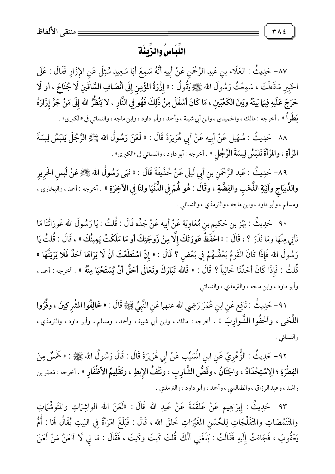 ٩٣ - حَدِيثُ: إِبرَاهِيم عَنْ عَلقَمَةَ عَنْ عَبدِ الله قَالَ: "لَعَنَ الله الواشِمَاتِ والمتَوشِّمَاتِ والمتَنَمِّصَاتِ والمتَفَلِّجَاتِ لِلحُسْنِ المغَيِّرَاتِ خَلقَ الله، قَالَ: فَبَلَغَ امْرَأةً فِي البَيتِ يُقَالُ لَهَا: أُمُّ يَعْقُوبَ، فَجَاءَتْ إِلَيهِ فَقَالَتْ: بَلَغَنِي أنَّكَ قُلتَ كَيتَ وكَيتَ، فَقَالَ: مَا لِي لَا ألعَنُ مَنْ لَعَنَ