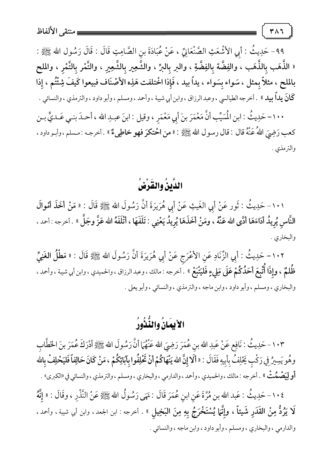 ٩٩ - حَدِيثُ: أبِي الأشْعَثِ الصَّنْعَانِيِّ، عَنْ عُبَادَةَ بنِ الصَّامِتِ قَالَ: قَالَ رَسُول الله صلى الله عليه وسلم: "الذَّهَب بِالذَّهَب، والفِضَّة بِالفِضَّةِ، والبر بِالبرِّ، والشَّعِير بِالشَّعِيرِ، والتَّمْر بِالتَّمْرِ، والملح بالملح، مثلًا بِمثل، سَواء بِسَواء، يدًا بيد، فَإِذا اخْتلفت هَذِه الأصْنَاف فبيعوا كَيفَ شِئْتُم، إِذا كَانَ يدًا بيد". أخرجه الطيالسي، وعبد الرزاق، وابن أبي شيبة، وأحمد، ومسلم، وأبو داود، والترمذي، والنسائي.