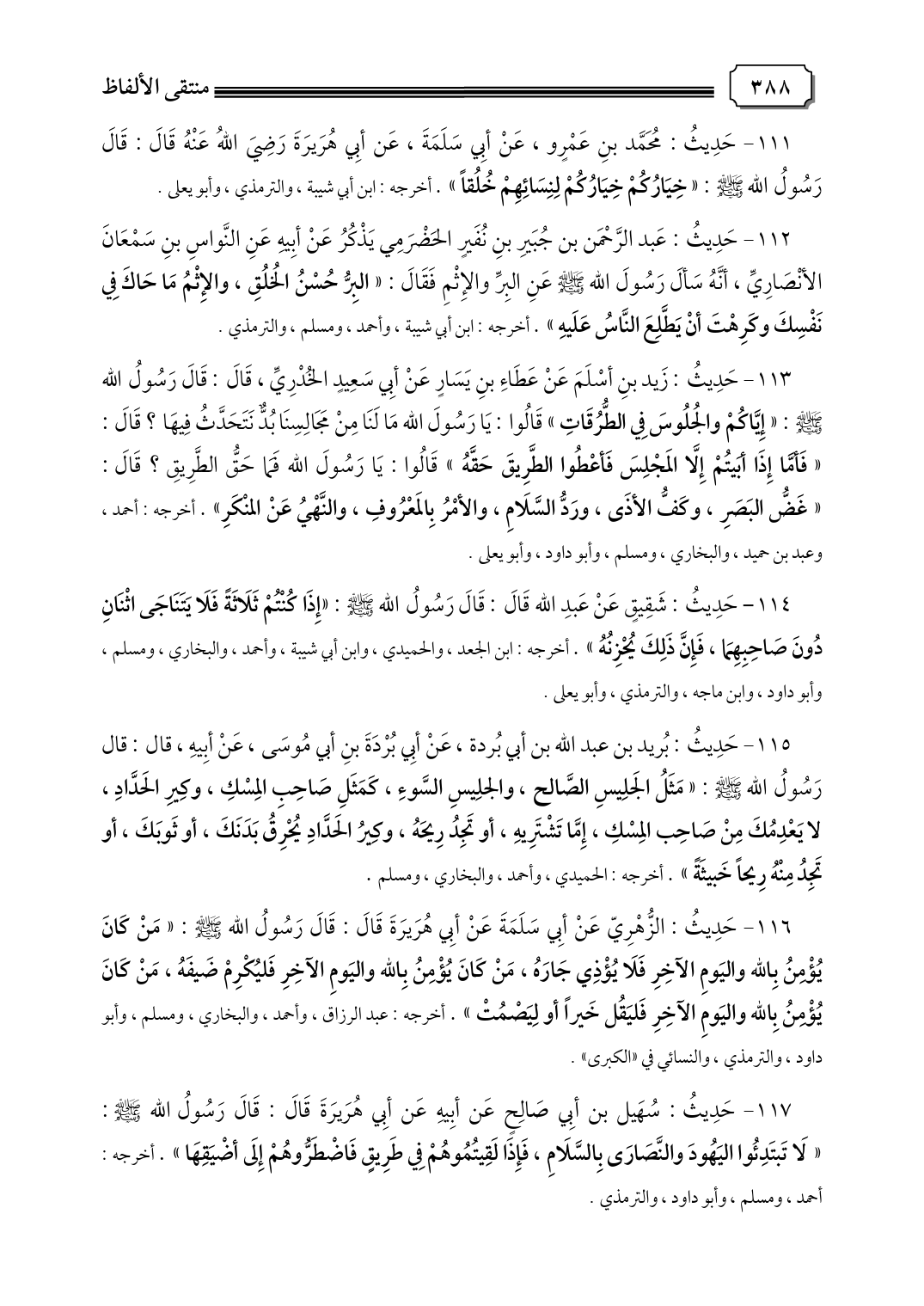 ١١١ - حَدِيثُ: مُحَمَّد بنِ عَمْرٍو، عَنْ أبِي سَلَمَةَ، عَن أبِي هُرَيرَةَ رَضِيَ اللهُ عَنْهُ قَالَ: قَالَ رَسُولُ الله صلى الله عليه وسلم: "خِيَارُكُمْ خِيَارُكُمْ لِنِسَائِهِمْ خُلُقًا". أخرجه: ابن أبي شيبة، والترمذي، وأبو يعلى.
