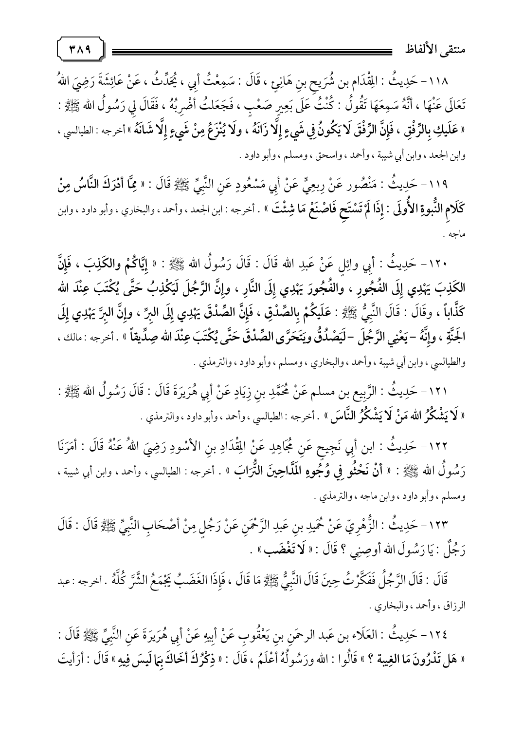 ١١٩ - حَدِيثُ: مَنْصُور عَنْ رِبعِيٍّ عَنْ أبِي مَسْعُودٍ عَنِ النَّبِيِّ صلى الله عليه وسلم قَالَ: "مِمَّا أدْرَكَ النَّاسُ مِنْ كَلَامِ النُّبوةِ الأُولَى: إِذَا لَمْ تَسْتَحِ فَاصْنَعْ مَا شِئْتَ". أخرجه: ابن الجعد، وأحمد، والبخاري، وأبو داود، وابن ماجه.