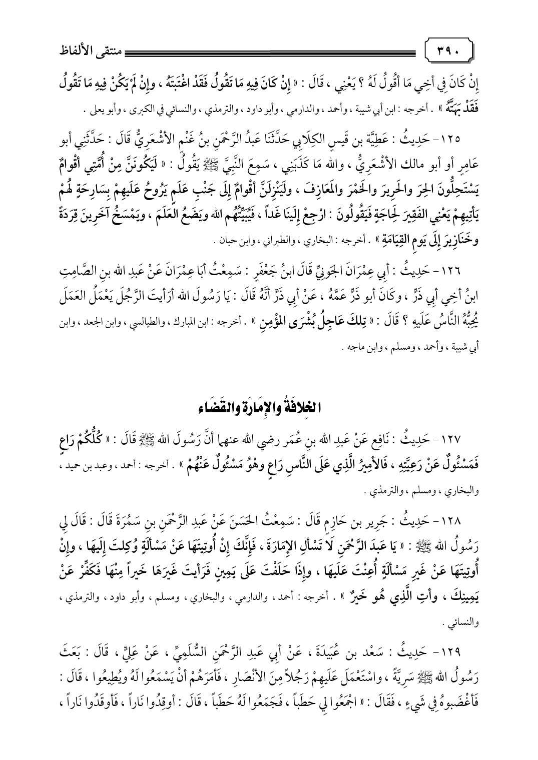 ١٢٩ - حَدِيثُ: سَعْد بن عُبَيدَةَ، عَنْ أبِي عَبدِ الرَّحْمَنِ السُّلَمِيِّ، عَنْ عَلِيٍّ، قَالَ: بَعَثَ رَسُولُ الله صلى الله عليه وسلم سَرِيَّةً، واسْتَعْمَلَ عَلَيهِمْ رَجُلًا مِنَ الأنْصَارِ، فَأمَرَهُمْ أنْ يَسْمَعُوا لَهُ ويُطِيعُوا، قَالَ: فَأغْضَبوهُ فِي شَيءٍ، فَقَالَ: "اجْمَعُوا لِي حَطَبًا، فَجَمَعُوا لَهُ حَطَبًا، قَالَ: أوقِدُوا نَارًا، فَأوقَدُوا نَارًا،