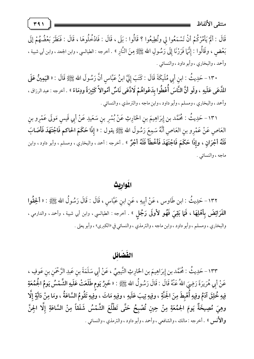 ١٣٢ - حَدِيثُ: ابن طَاوس، عَنْ أبِيهِ، عَنِ ابنِ عَبَّاسٍ، قَالَ: قَالَ رَسُولُ الله صلى الله عليه وسلم: "ألحِقُوا الفَرَائِضَ بِأهْلِهَا، فَمَا بَقِيَ فَهُو لأولَى رَجُلٍ". أخرجه: الطيالسي، وابن أبي شيبة، وأحمد، والدارمي، والبخاري، ومسلم، وأبو داود، وابن ماجه، والترمذي، والنسائي في "الكبرى" وأبو يعلى.