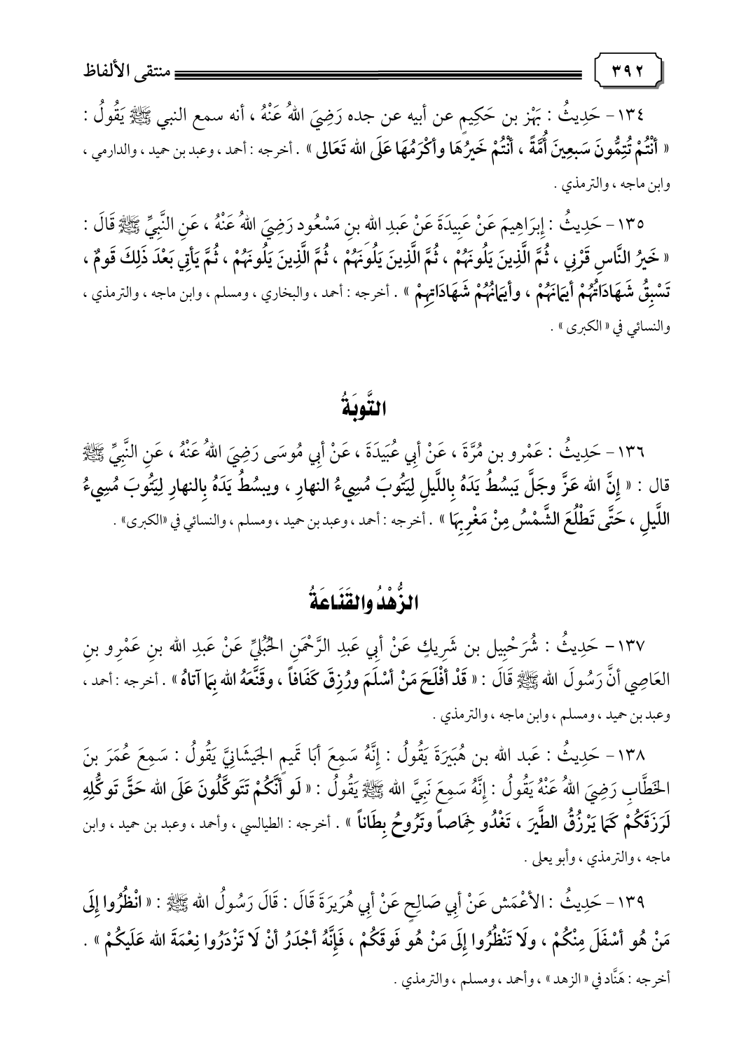 ١٣٥ - حَدِيثُ: إِبرَاهِيمَ عَنْ عَبِيدَةَ عَنْ عَبدِ اللهِ بنِ مَسْعُود رَضِيَ اللهُ عَنْهُ، عَنِ النَّبِيِّ صلى الله عليه وسلم قَالَ: "خَيرُ النَّاسِ قَرْنِي، ثُمَّ الَّذِينَ يَلُونَهُمْ، ثُمَّ الَّذِينَ يَلُونَهُمْ، ثُمَّ الَّذِينَ يَلُونَهُمْ، ثُمَّ يَأتِي بَعْدَ ذَلِكَ قَومٌ، تَسْبِقُ شَهَادَاتُهُمْ أيمَانَهُمْ، وأيمَانُهُمْ شَهَادَاتِهِمْ". أخرجه: أحمد، والبخاري، ومسلم، وابن ماجه، والترمذي، والنسائي في "الكبرى".