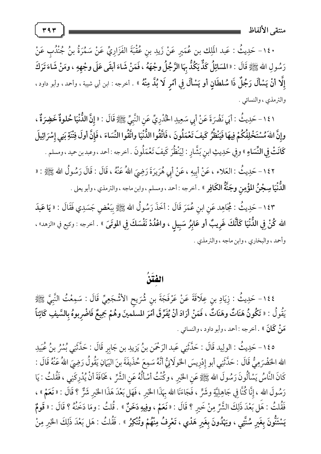 ١٤٠ - حَدِيثُ: عَبد المَلِك بن عُمَيرٍ عَنْ زَيدِ بنِ عُقْبَةَ الفَزَارِيِّ عَنْ سَمُرَةُ بنُ جُنْدُبٍ عَنْ رَسُولِ الله صلى الله عليه وسلم قَالَ: "المسَائِلُ كَدٌّ يَكُدُّ بِهَا الرَّجُلُ وجْهَهُ، فَمَنْ شَاءَ أبقَى عَلَى وجْهِهِ، ومَنْ شَاءَ تَرَكَ إِلَّا أنْ يَسْألَ رَجُلٌ ذَا سُلطَانٍ أو يَسْألَ فِي أمْرٍ لَا بُدَّ مِنْهُ". أخرجه: ابن أبي شيبة، وأحمد، وأبو داود، والترمذي، والنسائي.