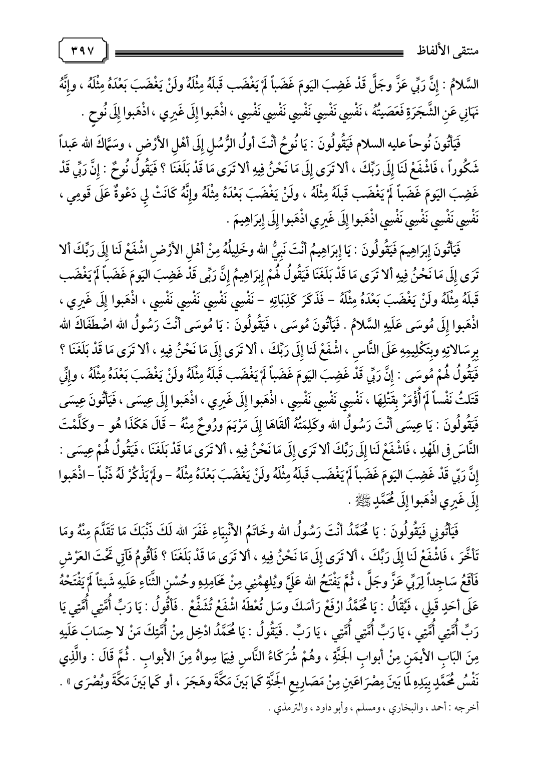 فَيَأتُونَ إِبرَاهِيمَ فَيَقُولُونَ: يَا إِبرَاهِيمُ أنْتَ نَبِيُّ الله وخَلِيلُهُ مِنْ أهْلِ الأرْضِ اشْفَعْ لَنا إِلَى رَبِّكَ ألا تَرَى إِلَى مَا نَحْنُ فِيهِ ألا تَرَى مَا قَدْ بَلَغَنَا فَيَقُولُ لَهُمْ إِبرَاهِيمُ إِنَّ رَبِّى قَدْ غَضِبَ اليَومَ غَضَبًا لَمْ يَغْضَب قَبلَهُ مِثْلَهُ ولَنْ يَغْضَبَ بَعْدَهُ مِثْلَهُ - فَذَكَرَ كَذِبَاتِهِ - نَفْسِي نَفْسِي نَفْسِي نَفْسِي، اذْهَبوا إِلَى غَيرِي، اذْهَبوا إِلَى مُوسَى عَلَيهِ السَّلامُ. فَيَأتُونَ مُوسَى، فَيَقُولُونَ: يَا مُوسَى أنْتَ رَسُولُ الله اصْطَفَاكَ الله بِرِسَالاتِهِ وبِتَكْلِيمِهِ عَلَى النَّاسِ، اشْفَعْ لَنا إِلَى رَبِّكَ، ألا تَرَى إِلَى مَا نَحْنُ فِيهِ، ألا تَرَى مَا قَدْ بَلَغَنَا؟ فَيَقُولُ لَهُمْ مُوسَى: إِنَّ رَبِّي قَدْ غَضِبَ اليَومَ غَضَبًا لَمْ يَغْضَب قَبلَهُ مِثْلَهُ ولَنْ يَغْضَبَ بَعْدَهُ مِثْلَهُ، وإِنِّي قَتَلتُ نَفْسًا لَمْ أُؤْمَرْ بِقَتْلِهَا، نَفْسِي نَفْسِي نَفْسِي، اذْهَبوا إِلَى غَيرِي، اذْهَبوا إِلَى عِيسَى، فَيَأتُونَ عِيسَى فَيَقُولُونَ: يَا عِيسَى أنْتَ رَسُولُ الله وكَلِمَتُهُ ألقَاهَا إِلَى مَرْيَمَ ورُوحٌ مِنْهُ - قَالَ هَكَذَا هُو - وكَلَّمْتَ النَّاسَ فِي الَمهْدِ، فَاشْفَعْ لَنا إِلَى رَبِّكَ ألا تَرَى إِلَى مَا نَحْنُ فِيهِ، ألا تَرَى مَا قَدْ بَلَغَنَا، فَيَقُولُ لَهُمْ عِيسَى: إِنَّ رَبّي قَدْ غَضِبَ اليَومَ غَضَبًا لَمْ يَغْضَب قَبلَهُ مِثْلَهُ ولَنْ يَغْضَبَ بَعْدَهُ مِثْلَهُ - ولَمْ يَذْكُرْ لَهُ ذَنْبًا - اذْهَبوا إِلَى غَيرِي اذْهَبوا إِلَى مُحَمَّدٍ صلى الله عليه وسلم.