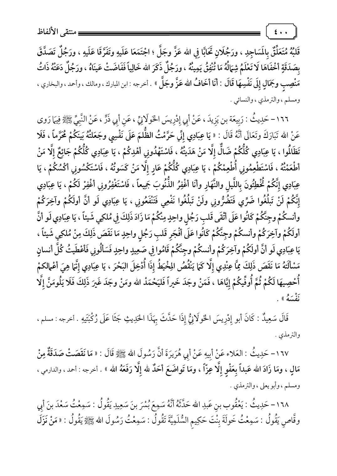١٦٦ - حَدِيثُ: رَبِيعَة بن يَزِيدَ، عَنْ أبِي إِدْرِيسَ الخَولَانِيِّ، عَنِ أبِي ذَرٍّ، عَنْ النَّبِيِّ صلى الله عليه وسلم فِيمَا رَوى عَنْ الله تَبَارَكَ وتَعَالَى أنَّهُ قَالَ: "يَا عِبَادِي إِنِّي حَرَّمْتُ الظُّلمَ عَلَى نَفْسِي وجَعَلتُهُ بَينَكُمْ مُحَرَّمًا، فَلَا تَظَالَمُوا، يَا عِبَادِي كُلُّكُمْ ضَالٌّ إِلَّا مَنْ هَدَيتُهُ، فَاسْتَهْدُونِي أهْدِكُمْ، يَا عِبَادِي كُلُّكُمْ جَائِعٌ إِلَّا مَنْ أطْعَمْتُهُ، فَاسْتَطْعِمُونِي أُطْعِمْكُمْ، يَا عِبَادِي كُلُّكُمْ عَارٍ إِلَّا مَنْ كَسَوتُهُ، فَاسْتَكْسُونِي أكْسُكُمْ، يَا عِبَادِي إِنَّكُمْ تُخْطِئُونَ بِاللَّيلِ والنَّهَارِ وأنَا أغْفِرُ الذُّنُوبَ جَمِيعًا، فَاسْتَغْفِرُونِي أغْفِرْ لَكُمْ، يَا عِبَادِي إِنَّكُمْ لَنْ تَبلُغُوا ضَرِّي فَتَضُرُّونِي ولَنْ تَبلُغُوا نَفْعِي فَتَنْفَعُونِي، يَا عِبَادِي لَو أنَّ أولَكُمْ وآخِرَكُمْ وإنسكُمْ وجِنَّكُمْ كَانُوا عَلَى أتْقَى قَلبِ رَجُلٍ واحِدٍ مِنْكُمْ مَا زَادَ ذَلِكَ فِي مُلكِي شَيئًا، يَا عِبَادِي لَو أنَّ أولَكُمْ وآخِرَكُمْ وإنسكُمْ وجِنَّكُمْ كَانُوا عَلَى أفْجَرِ قَلبِ رَجُلٍ واحِدٍ مَا نَقَصَ ذَلِكَ مِنْ مُلكِي شَيئًا، يَا عِبَادِي لَو أنَّ أولَكُمْ وآخِرَكُمْ وإنسكُمْ وجِنَّكُمْ قَامُوا فِي صَعِيدٍ واحِدٍ فَسَألُونِي فَأعْطَيتُ كُلَّ إنسانٍ مَسْألَتهُ مَا نَقَصَ ذَلِكَ مِمَّا عِنْدِي إِلَّا كَمَا يَنْقُصُ المِخْيَطُ إِذَا أُدْخِلَ البَحْرَ، يَا عِبَادِي إِنَّمَا هِيَ أعْمالكمْ أُحْصِيهَا لَكُمْ ثُمَّ أُوفِّيكُمْ إِيَّاهَا، فَمَنْ وجَدَ خَيرًا فَليَحْمَدْ الله ومَنْ وجَدَ غَيرَ ذَلِكَ فَلَا يَلُومَنَّ إِلَّا نَفْسَهُ".