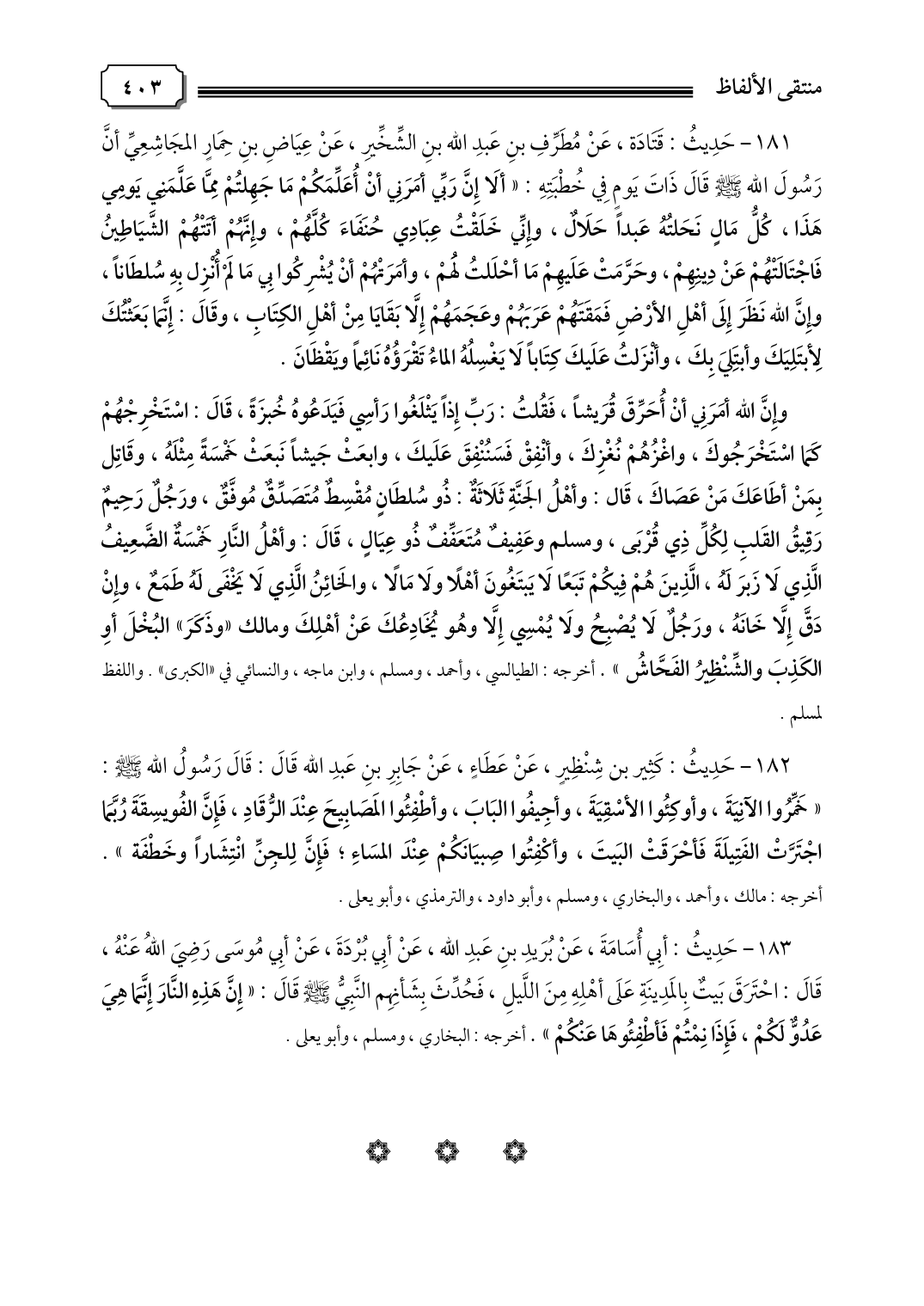 ١٨١ - حَدِيثُ: قَتَادَة، عَنْ مُطَرِّفِ بنِ عَبدِ الله بنِ الشِّخِّيرِ، عَنْ عِيَاضِ بنِ حِمَارٍ المجَاشِعِيِّ أنَّ رَسُولَ الله صلى الله عليه وسلم قَالَ ذَاتَ يَومٍ فِي خُطْبَتِهِ: "ألَا إِنَّ رَبِّي أمَرَنِي أنْ أُعَلِّمَكُمْ مَا جَهِلتُمْ مِمَّا عَلَّمَنِي يَومِي هَذَا، كُلُّ مَالٍ نَحَلتُهُ عَبدًا حَلَالٌ، وإِنِّي خَلَقْتُ عِبَادِي حُنَفَاءَ كُلَّهُمْ، وإِنَّهُمْ أتَتْهُمْ الشَّيَاطِينُ فَاجْتَالَتْهُمْ عَنْ دِينِهِمْ، وحَرَّمَتْ عَلَيهِمْ مَا أحْلَلتُ لَهُمْ، وأمَرَتْهُمْ أنْ يُشْرِكُوا بِي مَا لَمْ أُنْزِل بِهِ سُلطَانًا، وإِنَّ الله نَظَرَ إِلَى أهْلِ الأرْضِ فَمَقَتَهُمْ عَرَبَهُمْ وعَجَمَهُمْ إِلَّا بَقَايَا مِنْ أهْلِ الكِتَابِ، وقَالَ: إِنَّمَا بَعَثْتُكَ لِأبتَلِيَكَ وأبتَلِيَ بِكَ، وأنْزَلتُ عَلَيكَ كِتَابًا لَا يَغْسِلُهُ الماءُ تَقْرَؤُهُ نَائِمًا ويَقْظَانَ.