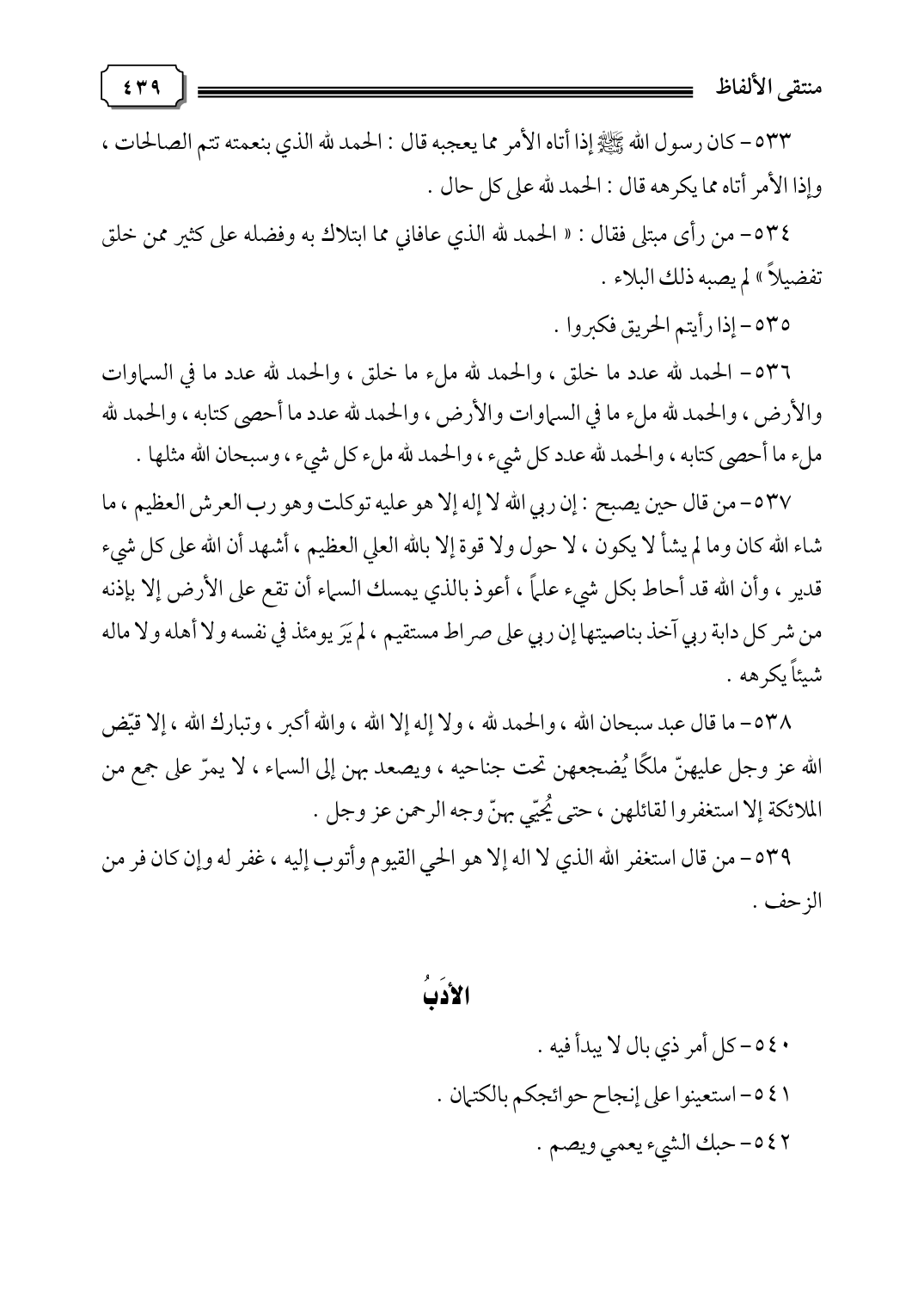 ٥٣٣ - كان رسول الله صلى الله عليه وسلم إذا أتاه الأمر مما يعجبه قال: الحمد لله الذي بنعمته تتم الصالحات، وإذا الأمر أتاه مما يكرهه قال: الحمد لله على كل حال.