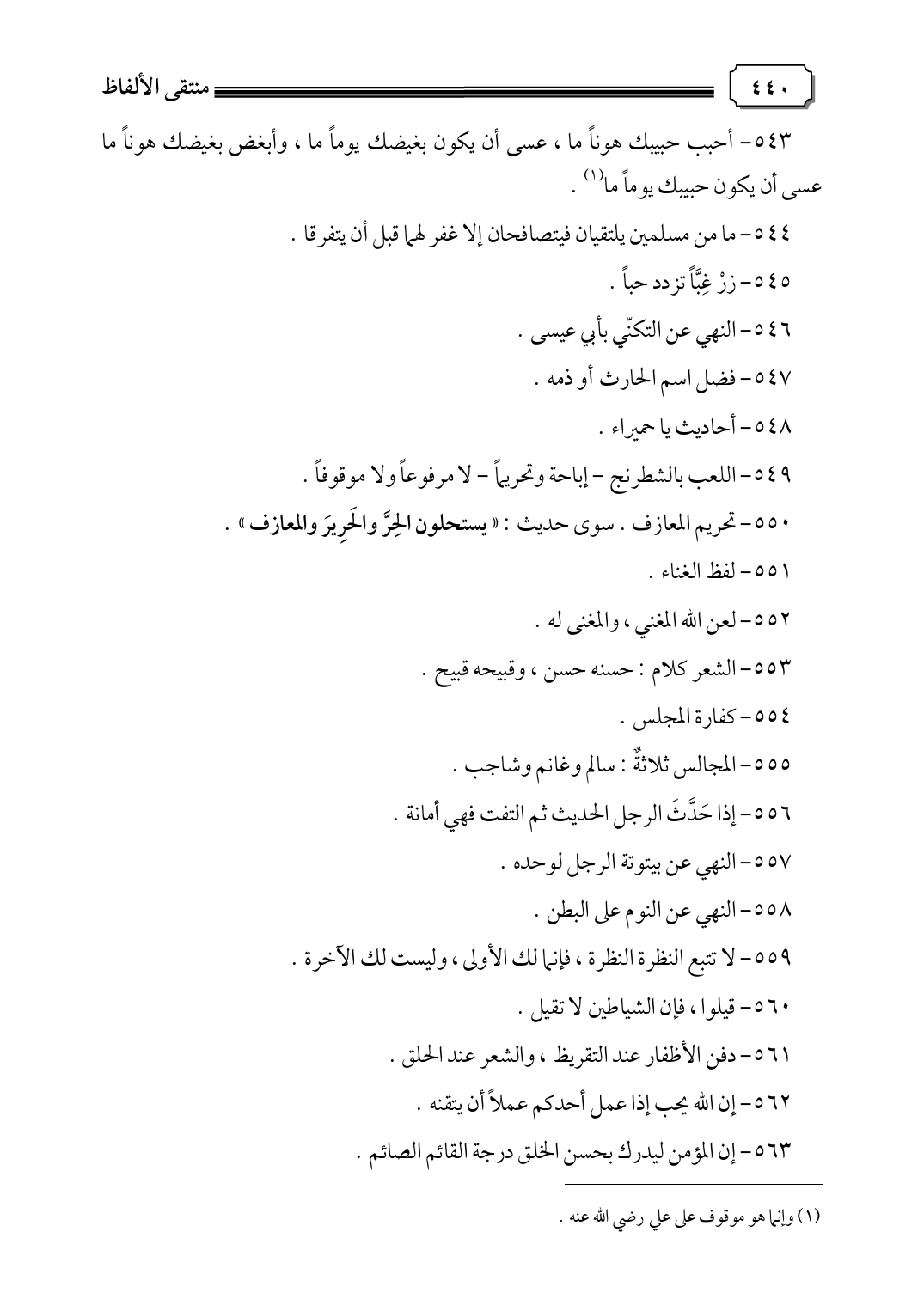 ٥٤٣ - أحبب حبيبك هونًا ما، عسى أن يكون بغيضك يومًا ما، وأبغض بغيضك هونًا ما عسى أن يكون حبيبك يومًا ما (١).
