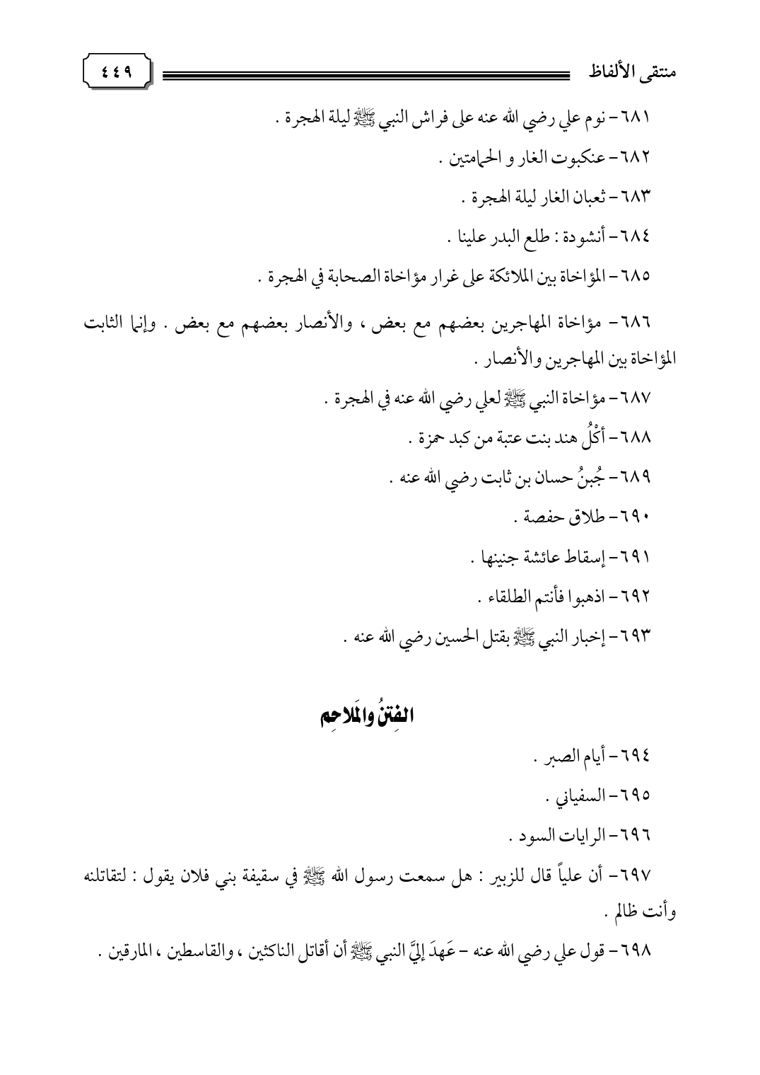 ٦٩٧ - أن عليًا قال للزبير: هل سمعت رسول الله صلى الله عليه وسلم في سقيفة بني فلان يقول: لتقاتلنه وأنت ظالم.