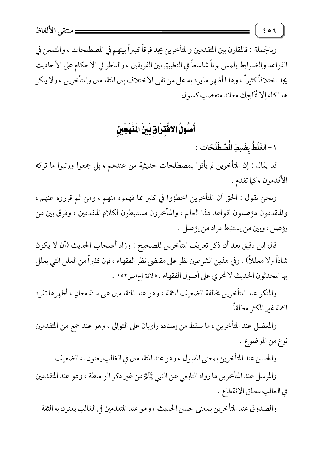 وبالجملة: فالمقارن بين المتقدمين والمتأخرين يجد فرقًا كبيرًا بينهم في المصطلحات، والمتمعن في القواعد والضوابط يلمس بونًا شاسعًا في التطبيق بين الفريقين، والناظر في الأحكام على الأحاديث يجد اختلافًا كثيرًا، وهذا أظهر ما يرد به على من نفى الاختلاف بين المتقدمين والمتأخرين، ولا ينكر هذا كله إلا مُمَاحِك معاند متعصب كسول.