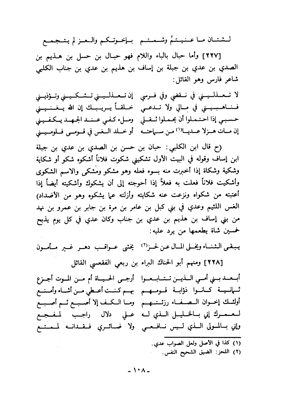 قال ابن الكلبي: حبان بن حسن بن الصدي بن عدي بن جبلة ابن إساف وقوله في البيت الأول تشكيني شكوت فلاناً أشكوه شكو أو شكاية وشكية وشكاة إذا أخبرت منه بسوء فعله وهو مشكو ومشكى والاسم الشكوى وأشكيت فلاناً فعلت به فعلاً إذا أحوجته إلى أن يشكوك وأشكيته أيضاً إذا أعتبته من شكواه ونزعت عنه شكايته وأزلته عما يشكوه وهو من الأضداد الغس اللئيم وعدي في بني كبل بن عامر بن مرة بن جابر بن عمرو بن نهد من بني إساف بن هذيم بن عدي بن جناب وكان عدي في كل يوم يذبح خمسين شاة يطعمها من يرد عليه: