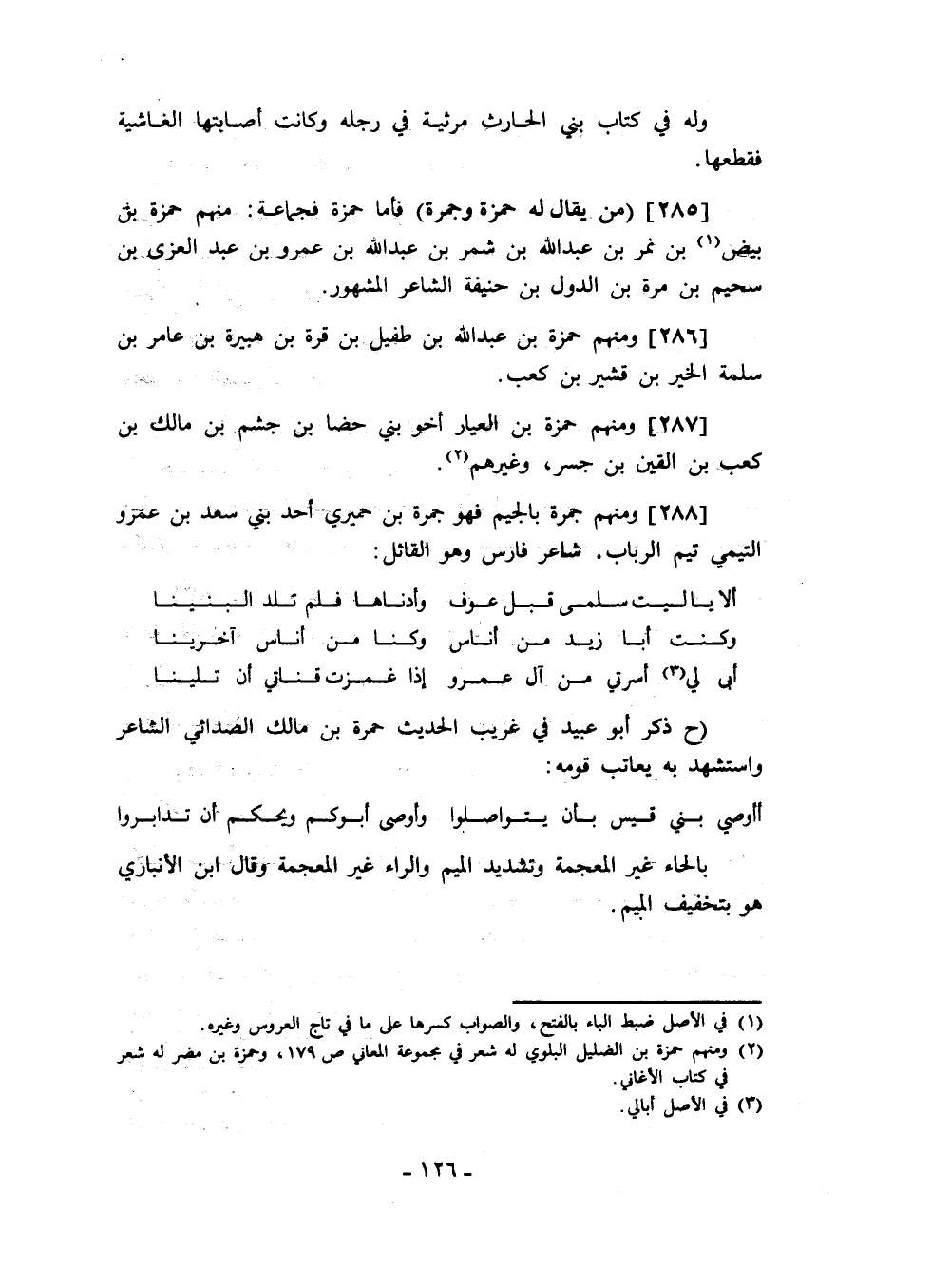 وله في كتاب بني الحارث مرثية في رجله وكانت أصابتها الغاشية فقطعها: من يقال له حمزة وجمرة فأما حمزة فجماعة: منهم حمزة بن بيض بن نمر بن عبد الله بن شمر بن عبد الله بن عمرو بن عبدا لعزى بن سحيم بن مرة بن الدول بن حنيفة الشاعر المشهور.