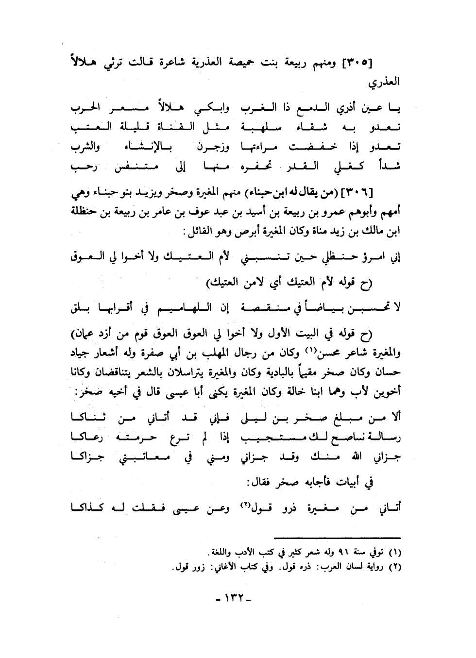 ومنهم ربيعة بنت حميصة العذرية شاعرة قالت ترثي هلالاً العذري