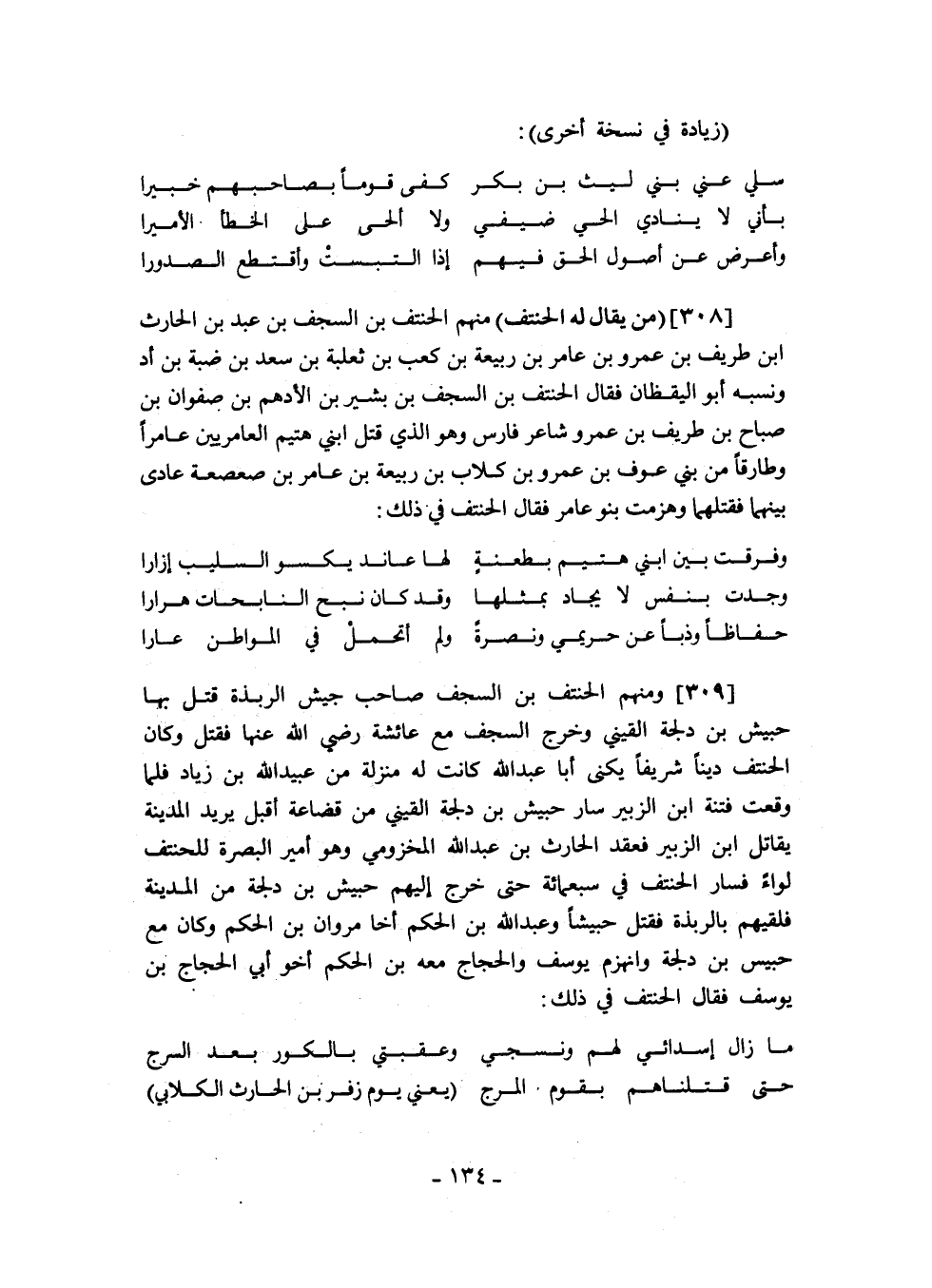 ومنهم الحنتف بن السجف صاحب جيش الربذة قتل بها حبيش بن دلجة القيني وخرج السجف مع عائشة رضي الله عنها فقتل وكان الحنتف ديناً شريفاً يكنى أبا عبد الله كانت له منزلة من عبيد الله بن زياد فلما وقعت فتنة ابن الزبير سار حبيش بن دلجة القيني من قضاة أقبل يريد المدينة يقاتل ابن الزبير فقعد الحارث بن عبد الله المخزومي وهو أمير البصرة للحنتف لواءً فسار الحنتف في سبعمائة حتى خرج إليهم حبيش بن دلجة من المدينة فلقيهم بالربذة فقتل حبيشاً وعبد الله بن الحكم أخا مروان بن الحكم وكان مع حبيس بن دلجة وانهزم يوسف والحجاج معه بن الحكم أخو أبي الحجاج بن يوسف فقال الحنتف في ذلك: