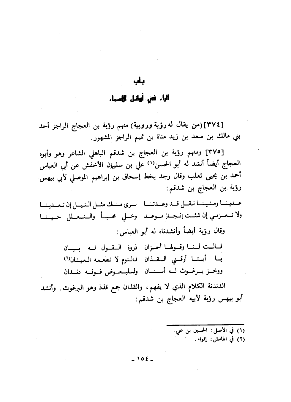 ومنهم رؤبة بن العجاج بن شدقم الباهلي الشاعر وهو وأبوه العجاج أيضاً أنشد له أبو الحسن علي بن سليمان الأخفش عن أبي العباس أحمد بن يحيى ثعلب وقال وجد بخط إسحاق بن إبراهيم الموصلي لأبي بيهس رؤبة بن العجاج بن شدقم: